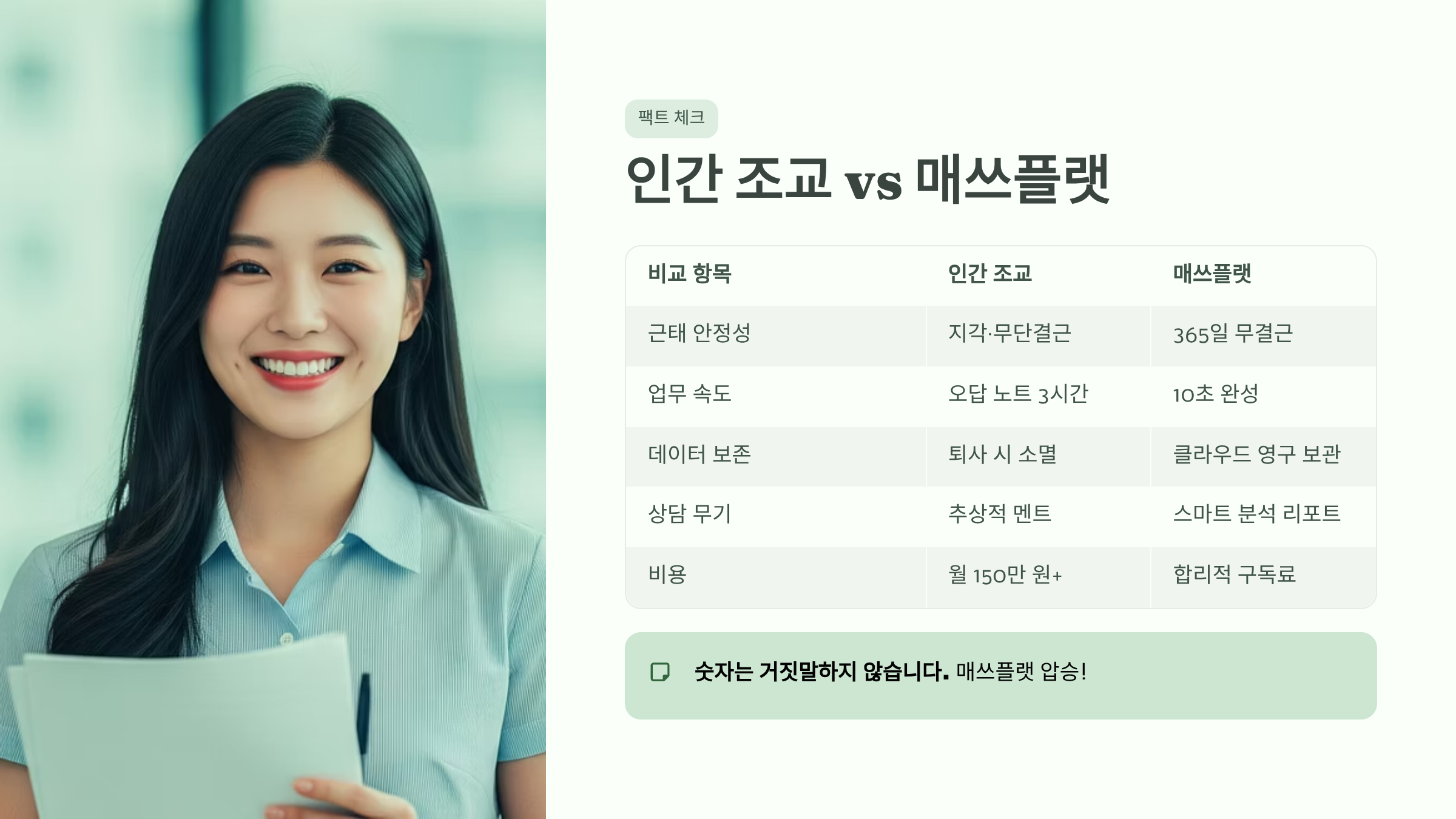 자, 이제 결단의 시간입니다. 매달 통장에서 꼬박꼬박 빠져나가는 인간 조교의 비싼 월급을 보며 쓰린 속을 소주로 달래시겠습니까? 아니면 지치지 않고 불평도 없는 0원짜리 매쓰플랫 수석 조교를 고용해, 그 남는 예산으로 맛있는 한우도 사 드시고 학원 시설 마케팅에 투자해 지역 원생을 싹쓸이하시겠습니까? 정답은 이미 원장님의 끄덕이는 고개에 나와 있습니다.