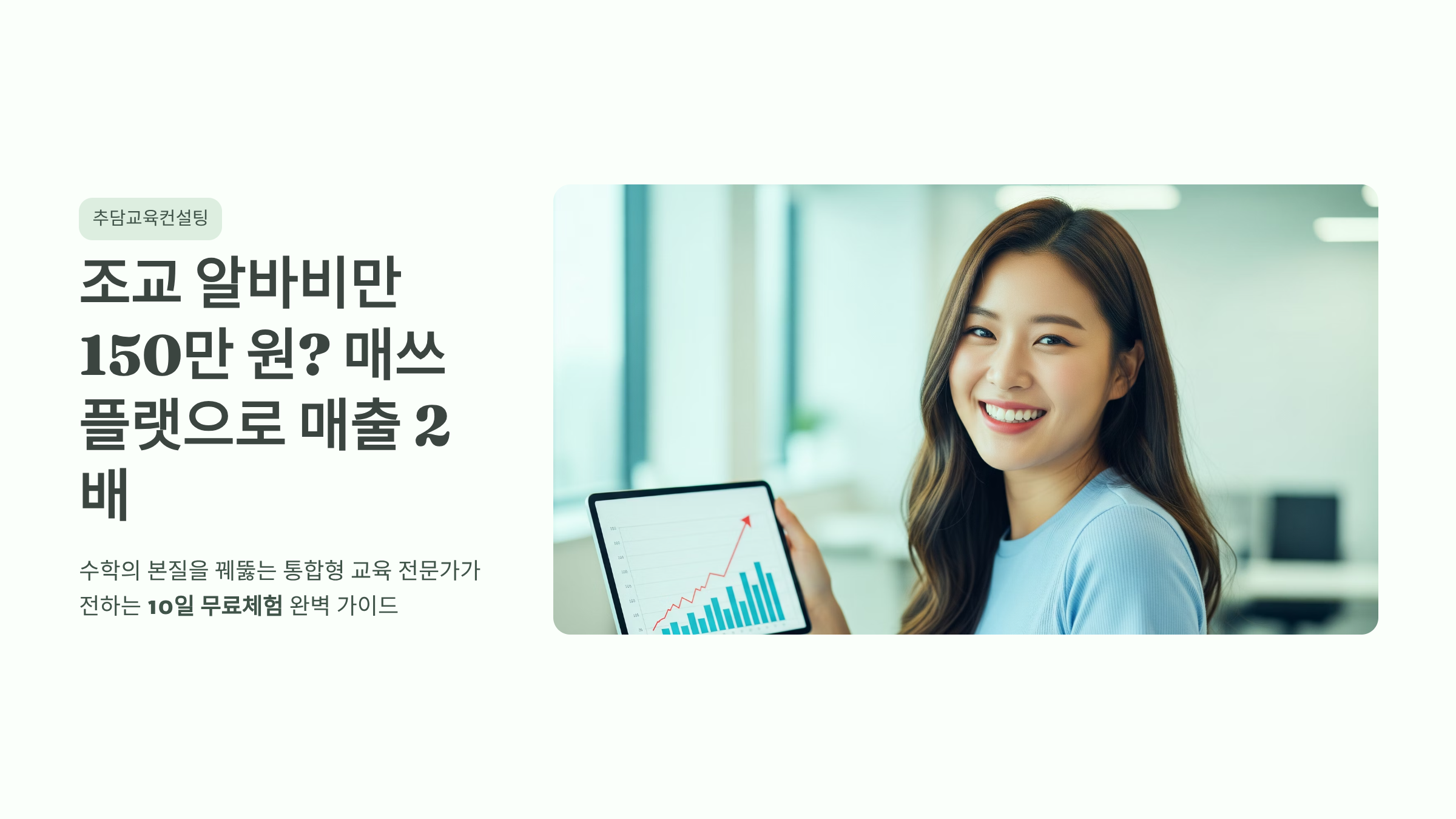 이쯤 되면 슬슬 마음이 동하시면서도, "이거 또 말로만 번지르르하게 약 파는 거 아니야?" 의심하시는 똑똑한 원장님들을 위해 특별히 준비했습니다. "조교 알바비만 150만 원?" 0원짜리 매쓰플랫 수석 조교로 학원 매출 2배 올리는 10일 무료체험에 얽힌 오해와 진실을 가감 없이 자연스럽고 유쾌하게 풀어드립니다.
