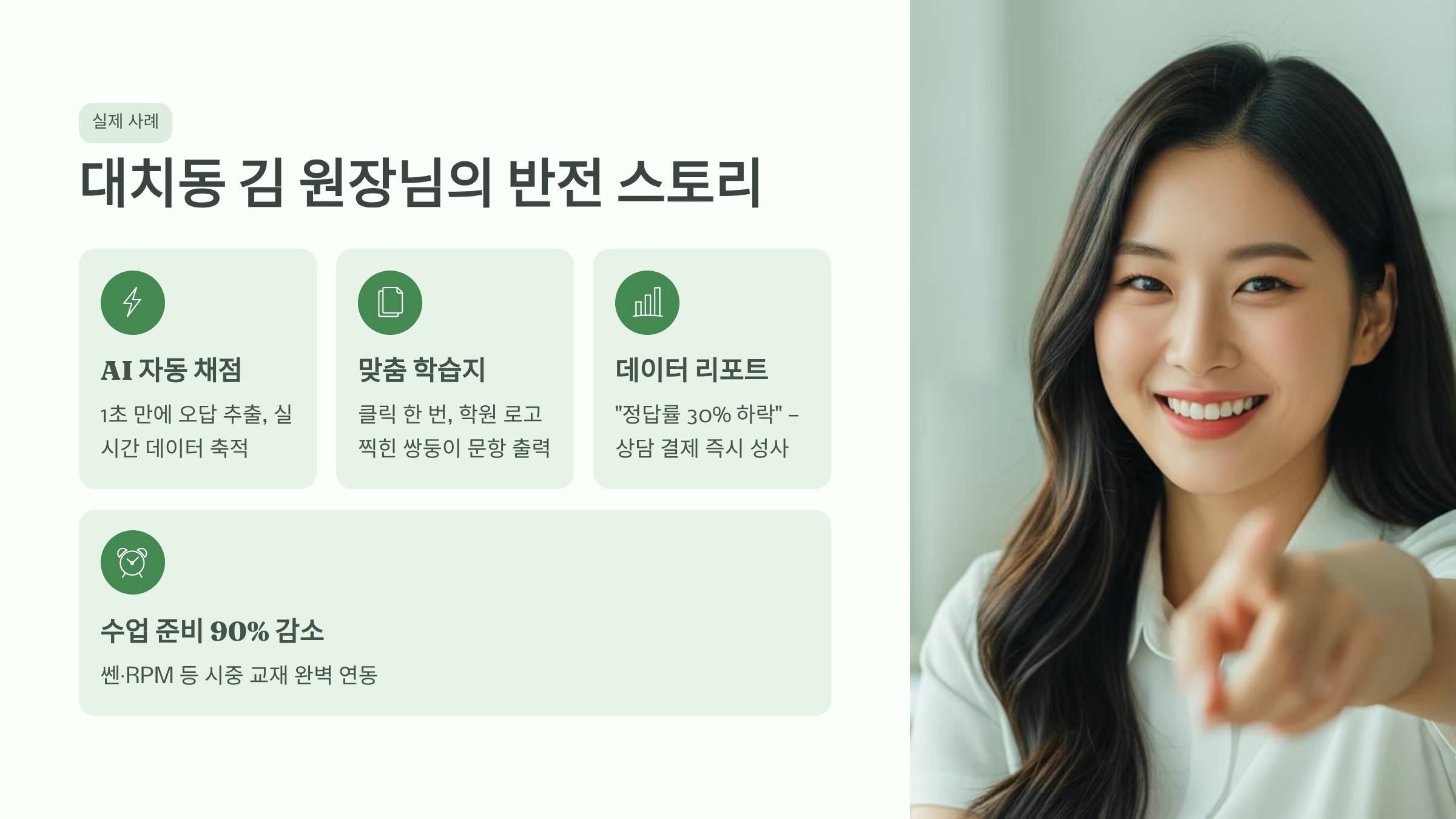 - 1초 만에 끝나는 AI 자동 채점: 아이들이 태블릿으로 답을 입력하면, 귀신같이 오답을 걸러내어 실시간으로 데이터를 축적합니다. 조교의 동그라미 실수로 학부모에게 사과할 일이 0%가 되었습니다.
