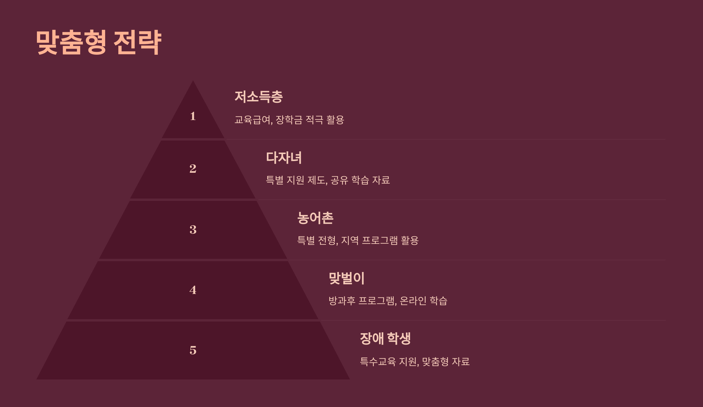 - 사각지대 해소: 무상교육 대상에서 제외되는 학생들을 위한 지원 방안을 마련하여 교육 사각지대를 해소해야 합니다.