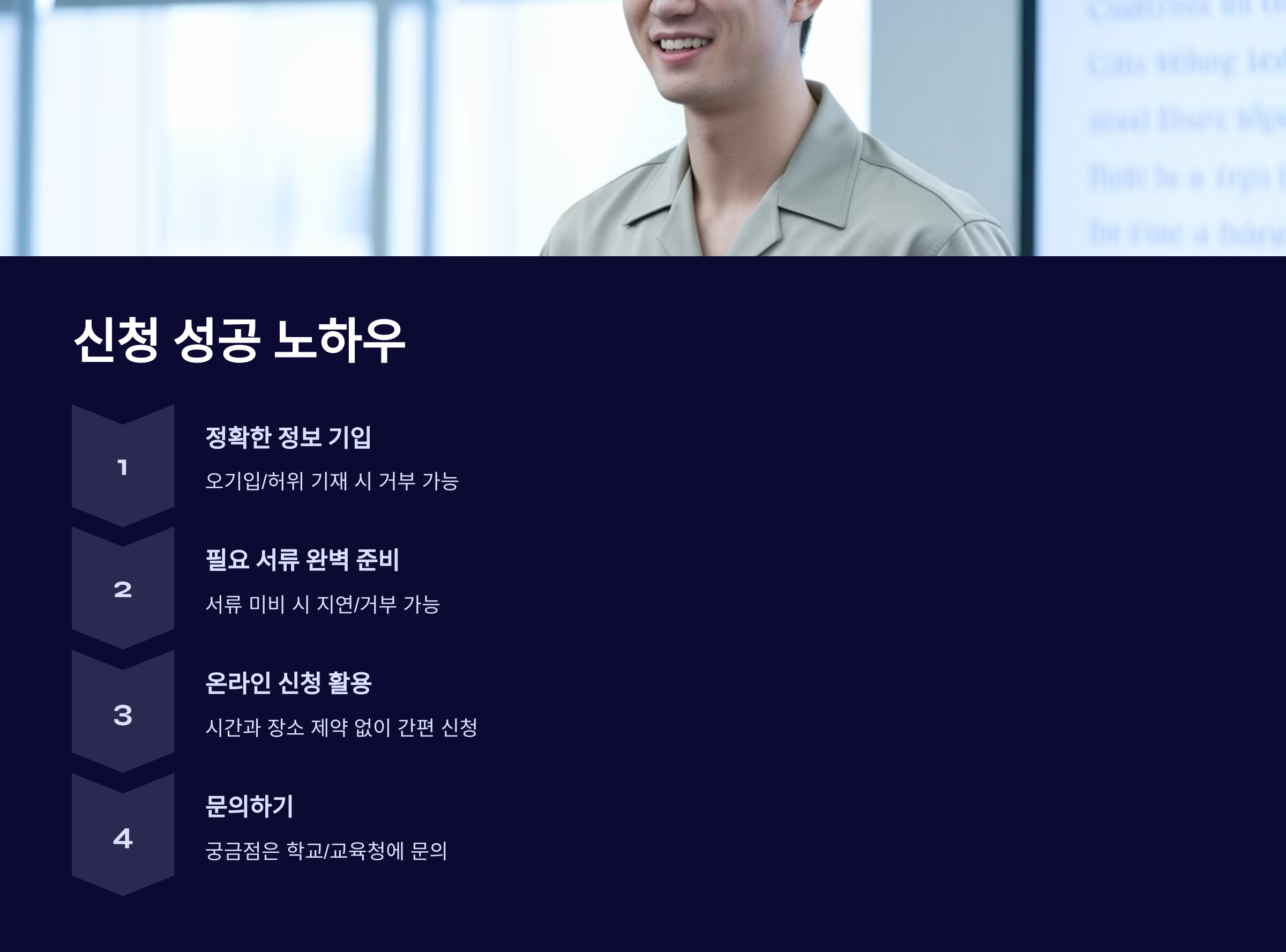- 학교 또는 교육청 문의: 신청 과정에서 궁금한 점이 있다면, 주저하지 말고 학교 또는 교육청에 문의하세요. 친절하게 안내해 줄 것입니다.