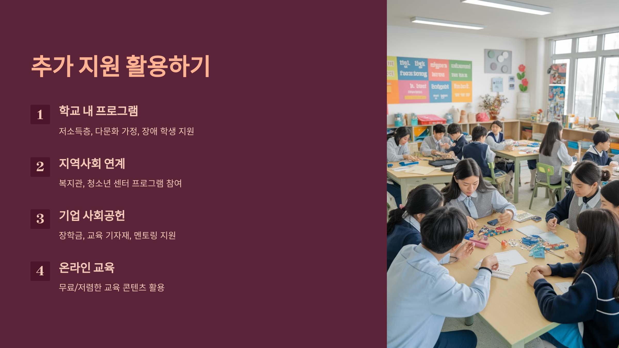 - 학교 내 지원 프로그램 활용: 각 학교에서는 저소득층 자녀, 다문화 가정 자녀, 장애 학생 등을 위한 다양한 지원 프로그램을 운영하고 있습니다. 학교 사회복지사 또는 상담 교사에게 문의하여 해당 프로그램을 적극적으로 활용하세요.