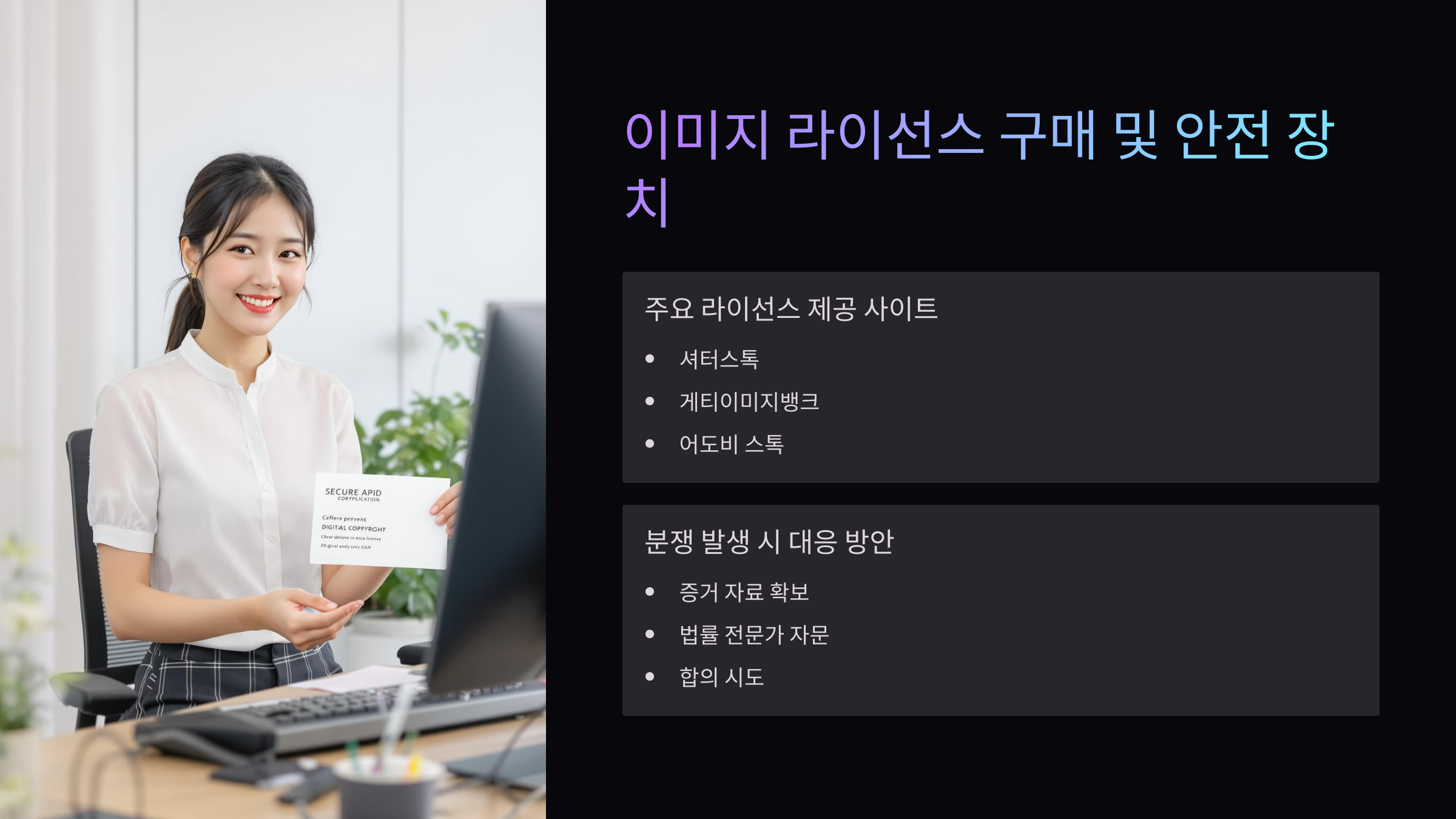- 2차적 저작물 작성 시 주의: 원본 이미지를 수정, 변형하여 사용하는 경우 2차적 저작물에 해당합니다.