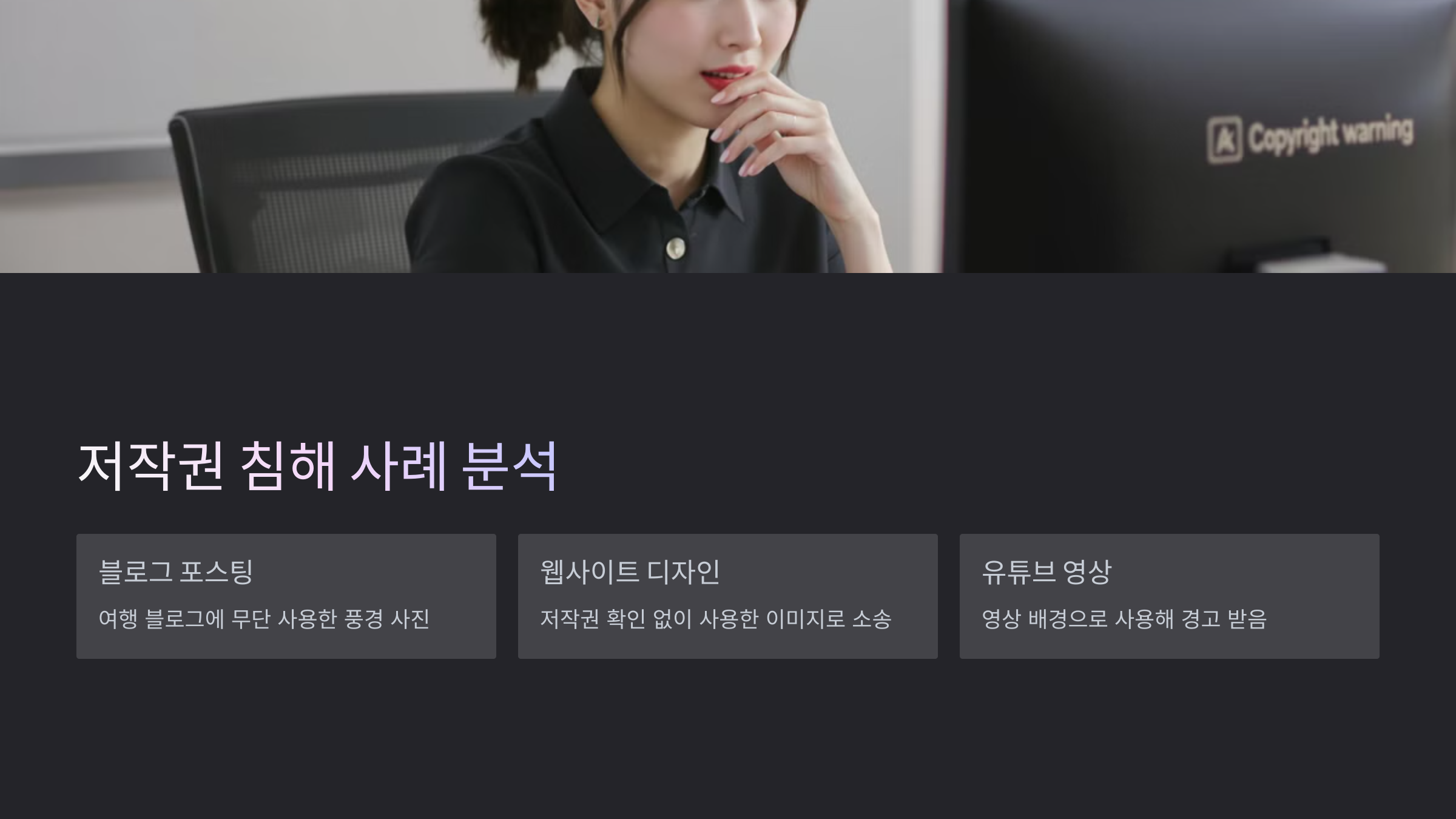 - 사례 2: 웹사이트 디자인에 사용한 이미지: 웹사이트 제작 업체 B사는 고객사의 웹사이트를 제작하면서 구글 이미지를 검색하여 찾은 이미지를 사용했습니다. B사는 해당 이미지의 저작권 정보를 확인하지 않고 사용했다가, 이미지 저작권자로부터 소송을 당했습니다.