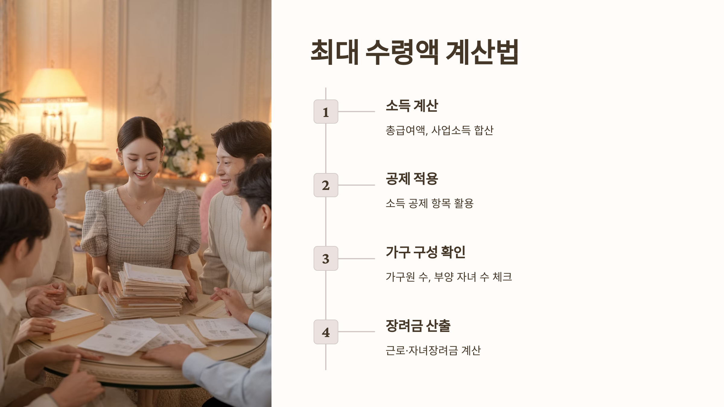 근로장려금 계산 시에는 총급여액 및 사업소득을 정확하게 파악해야 하며, 소득 공제 항목을 최대한 활용하여 과세 소득을 줄이는 것이 중요합니다. 자녀장려금은 부양 자녀의 연령과 장애 여부에 따라 지급액이 달라지므로, 관련 요건을 꼼꼼히 확인해야 합니다. 소득이 높을수록 장려금 지급액은 감소하지만, 각종 공제 항목을 활용하면 장려금을 최대한 확보할 수 있습니다.