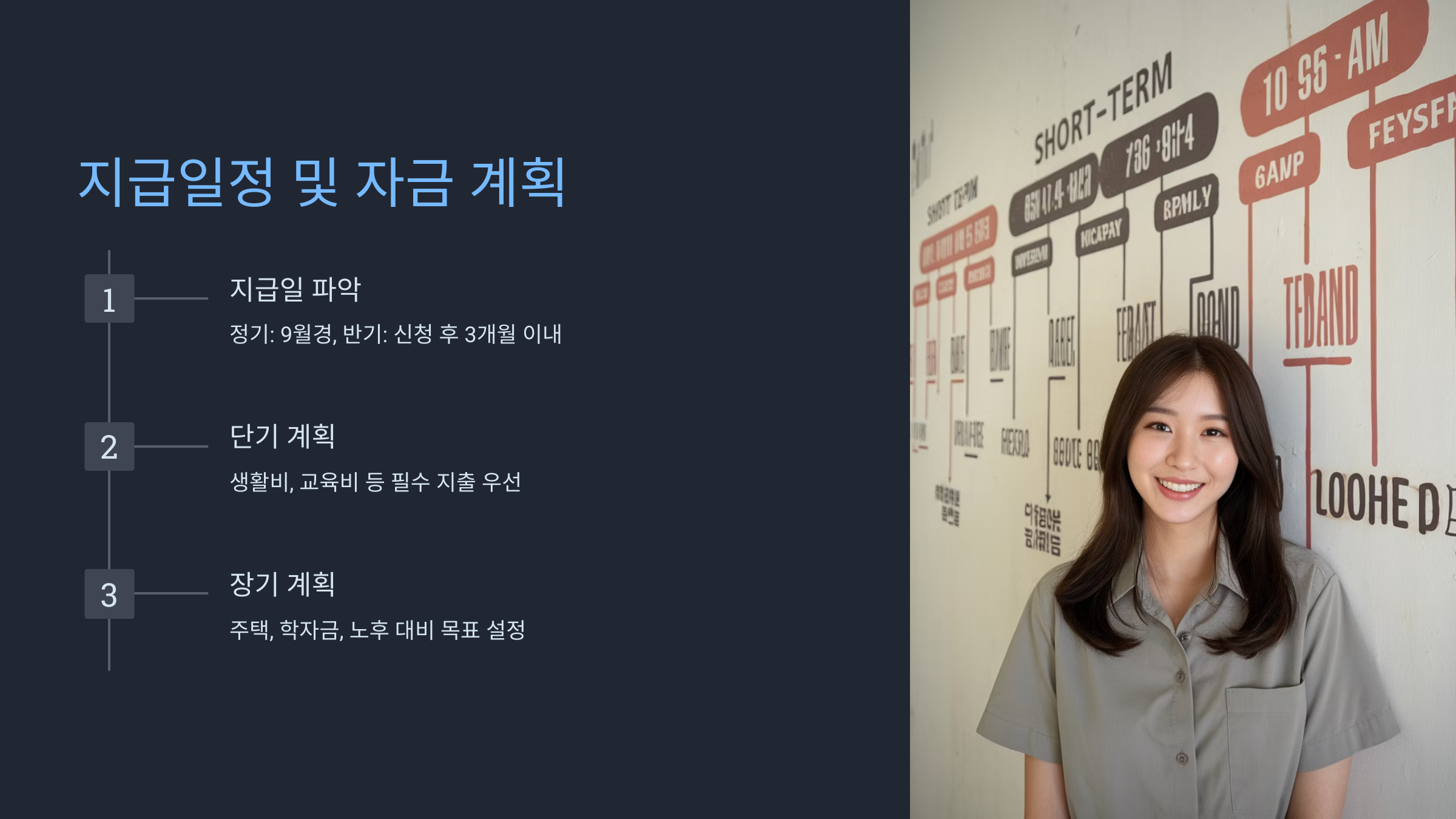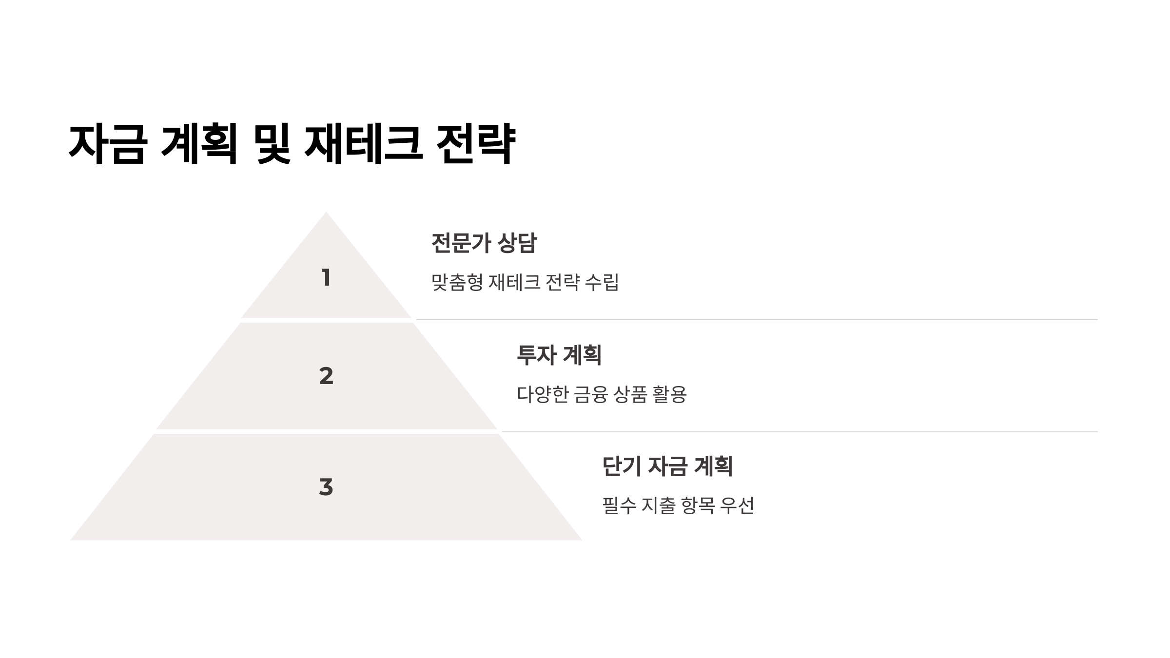 - 단기 자금 계획: 생활비, 교육비, 의료비 등 필수 지출 항목에 우선 사용