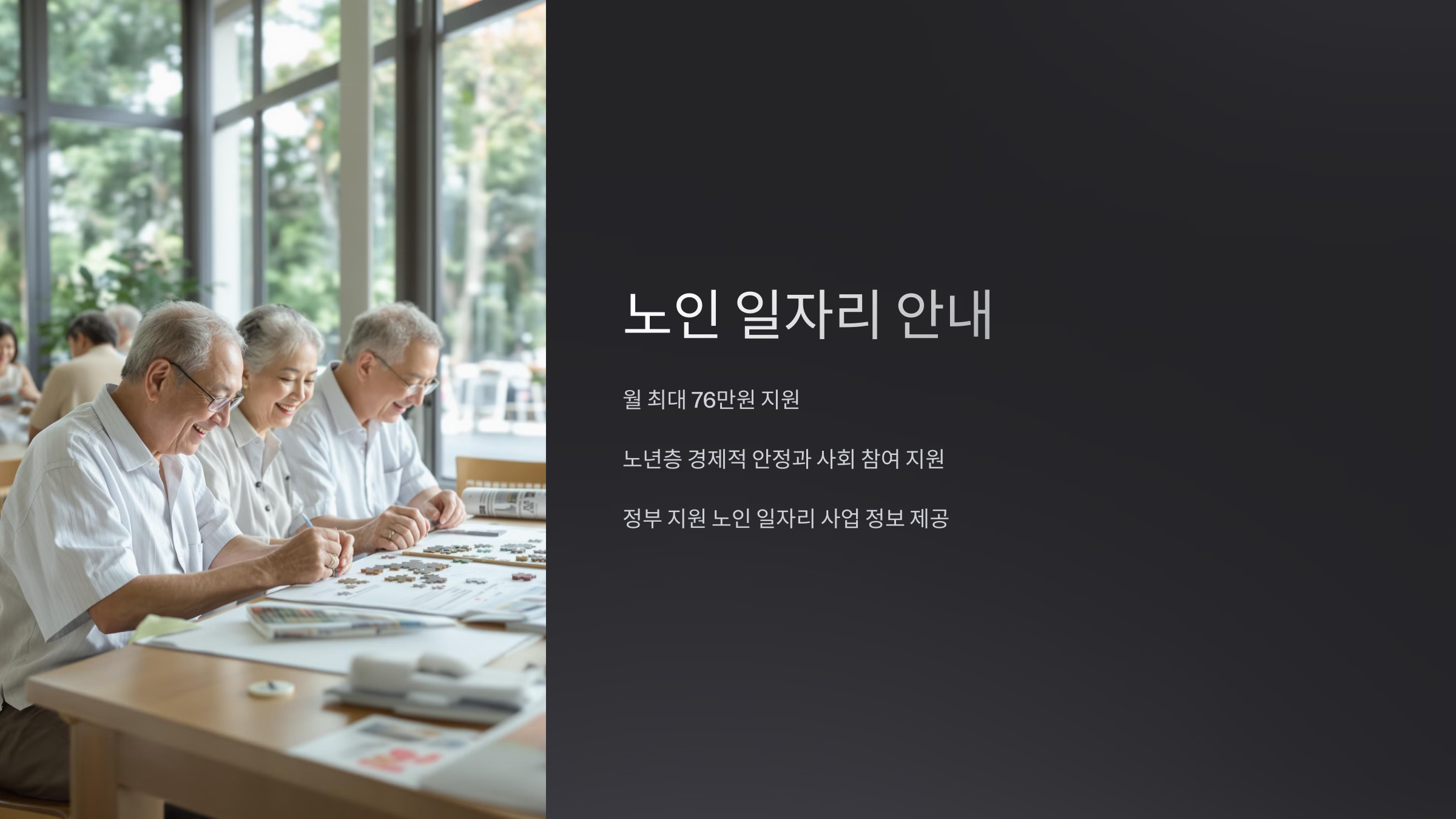- 고령자 친화기업: 노인의 경력을 활용하여 경쟁력을 갖추고 양질의 노인 일자리를 창출할 수 있는 기업의 설립 및 운영을 지원합니다.