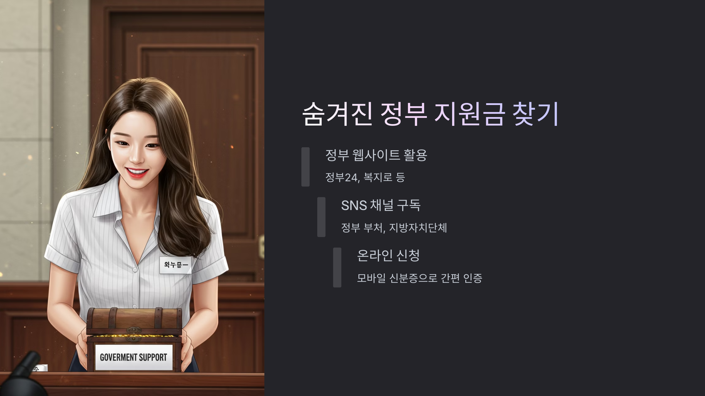 숨겨진 정부 지원금을 찾기 위해서는 적극적인 정보 탐색이 필요합니다. 정부24, 복지로 등 정부 운영 웹사이트를 활용하면 다양한 지원 정책 정보를 얻을 수 있습니다. 또한, 뉴스 기사, 블로그, 커뮤니티 등에서도 유용한 정보를 얻을 수 있습니다. 특히, 정부 부처 또는 지방자치단체에서 운영하는 SNS 채널을 구독하면 최신 지원 정책 정보를 빠르게 받아볼 수 있습니다.