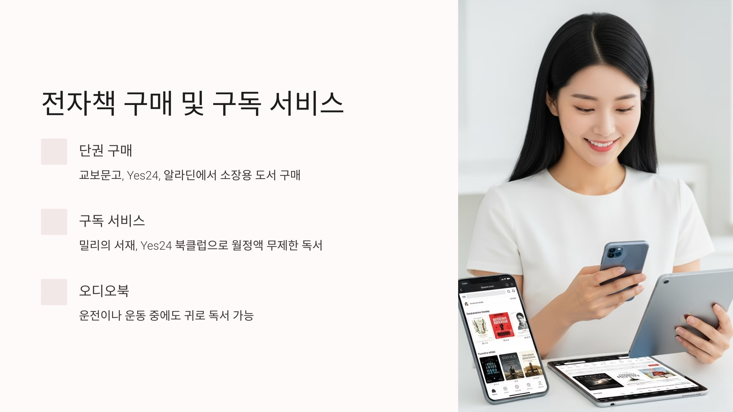 | 전자책(구독) | 밀리의 서재, Yes24 북클럽 | 월정액으로 무제한 독서 가능 | 다양한 분야의 트렌드를 파악하고 싶은 다독가 및 직장인 |