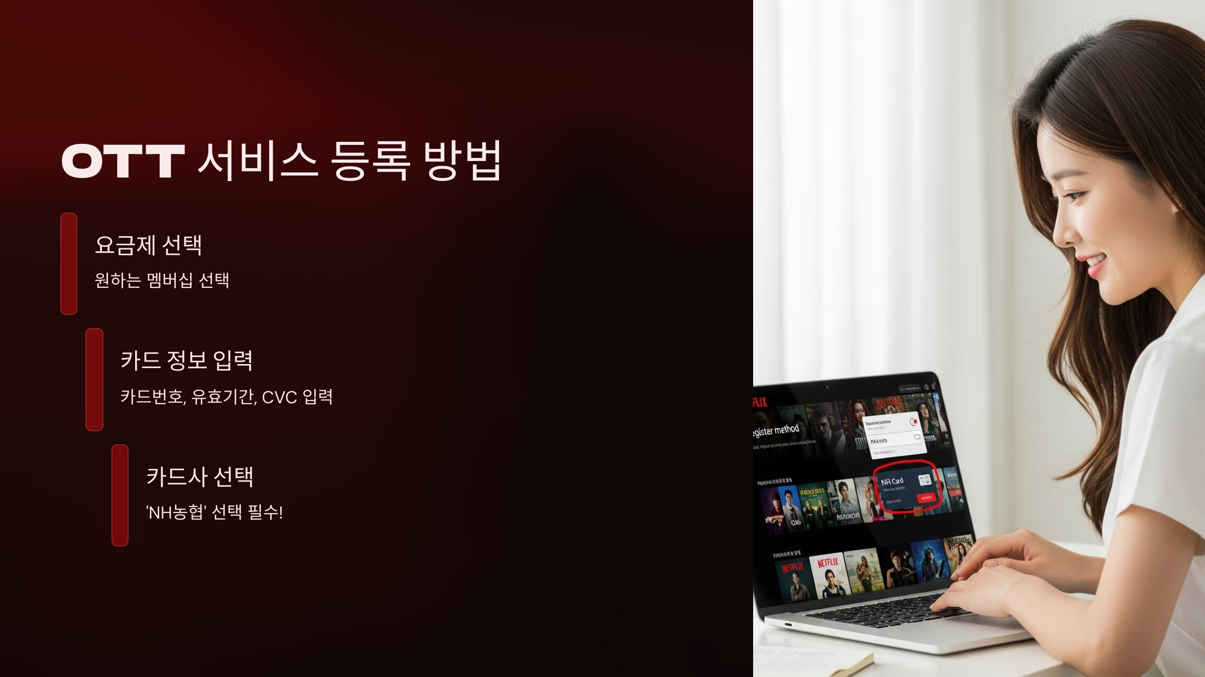사전 준비를 마쳤다면 이제 실제로 넷플릭스에 문화누리카드를 결제 수단으로 등록할 차례입니다. 아래의 단계별 설명은 넷플릭스를 기준으로 하지만, 티빙, 웨이브, 왓챠 등 다른 모든 OTT 서비스에서도 거의 동일하게 적용되므로 그대로 따라 하시면 됩니다.