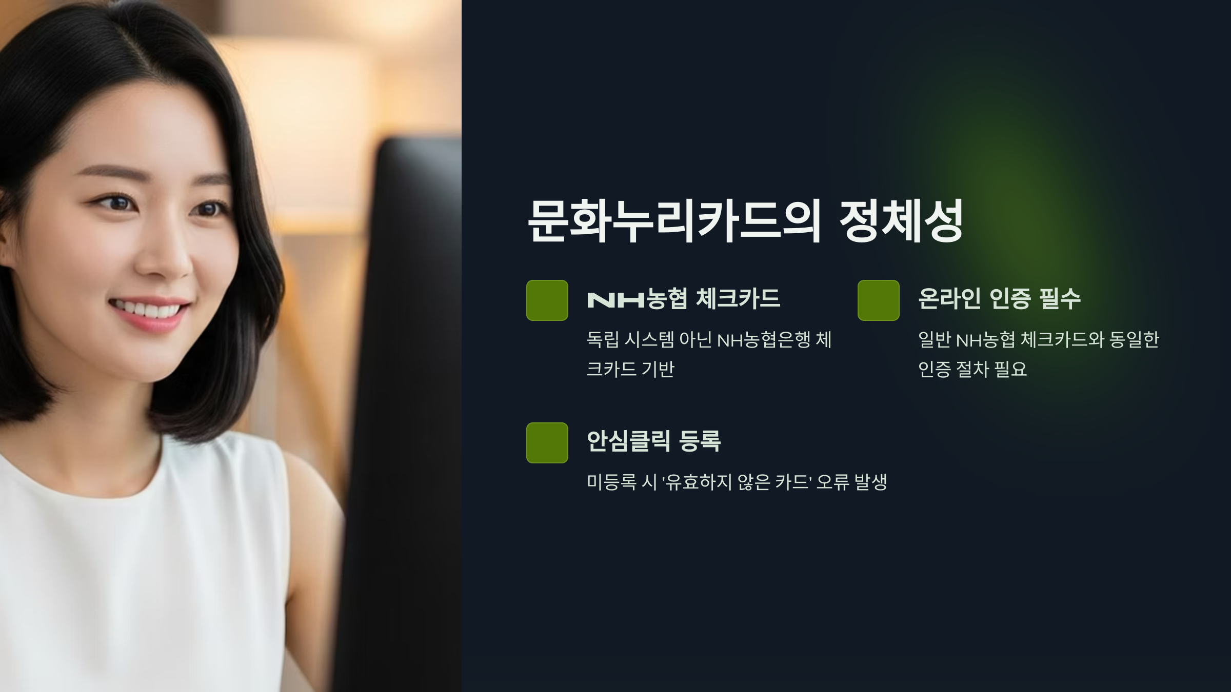 온라인 결제 실패를 겪는 가장 큰 이유는 '문화누리카드'의 정체성을 정확히 이해하지 못하기 때문입니다. 문화누리카드는 독립적인 결제 시스템을 가진 카드가 아니라, NH농협은행의 체크카드 결제망을 기반으로 운영되는 카드입니다. 따라서 온라인에서 이 카드를 사용하려면, 일반 NH농협 체크카드를 온라인에서 사용할 때와 동일한 인증 절차를 거쳐야 합니다.