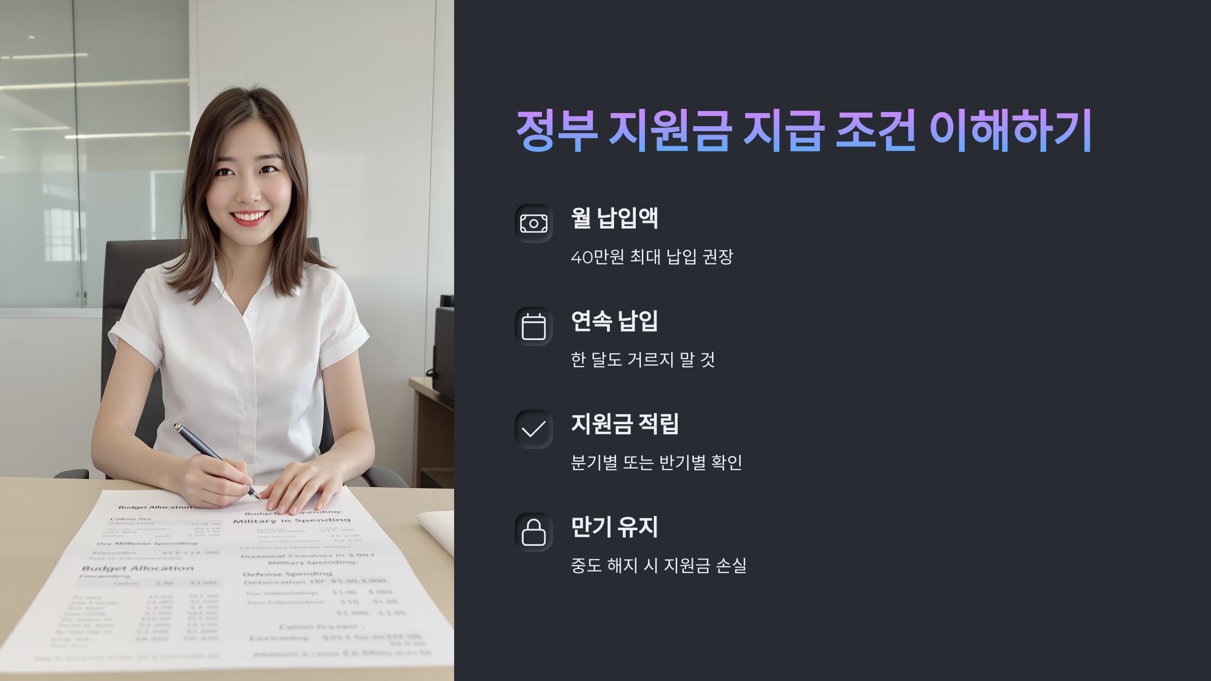 - 연속 납입의 중요성: 한 달이라도 납입을 거르면 해당 월의 정부 지원금은 받을 수 없습니다. 연속성이 중요합니다.