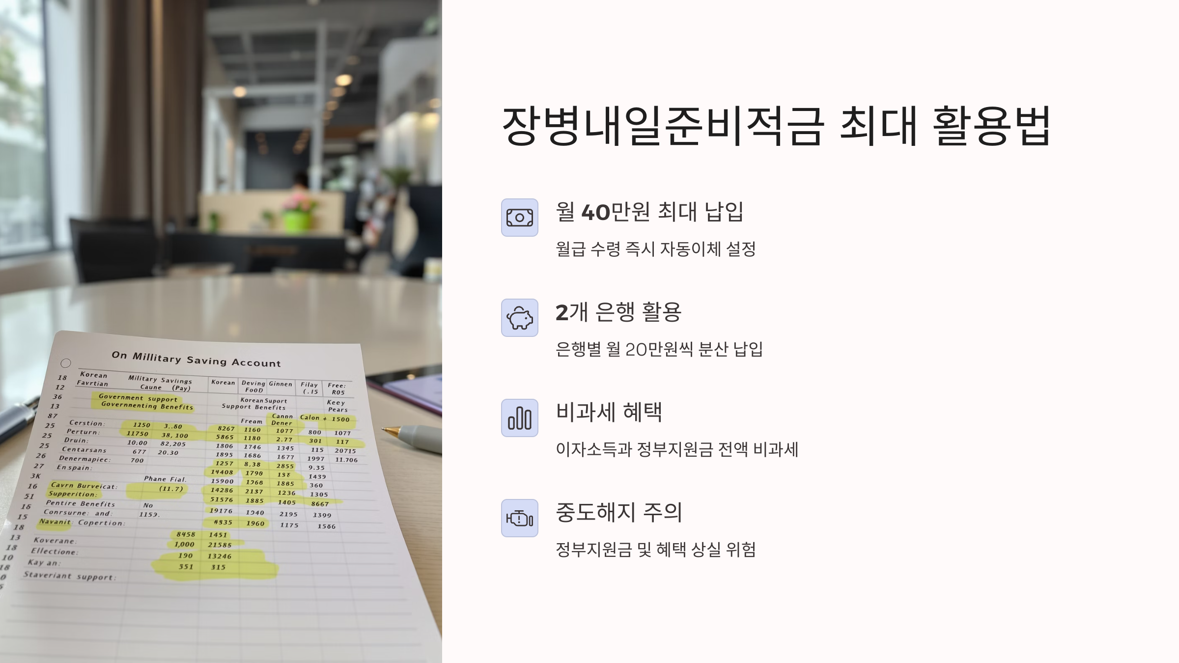 장병내일준비적금의 핵심은 정부 지원금과 비과세 이자입니다. 이를 조금이라도 더 늘리기 위한 추가적인 노력이 필요합니다.