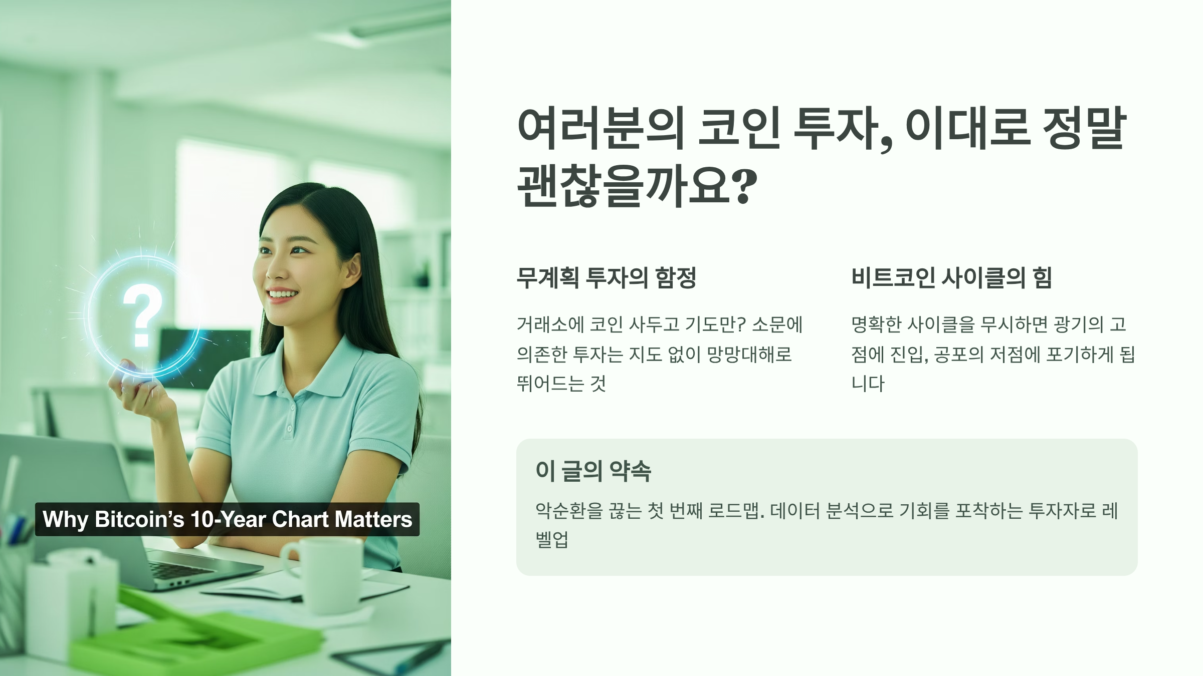 우리는 "차트도 모르고 감으로만 투자해도 될까?"라는 위험하고 막연한 질문에서 이 여정을 시작했습니다. 그리고 그 해답이 미래를 예측하는 마법 같은 기술이 아닌, 비트코인의 10년 역사 속에 숨겨진 반복되는 원칙과 사이클을 이해하는 것에 있음을 확인했습니다.