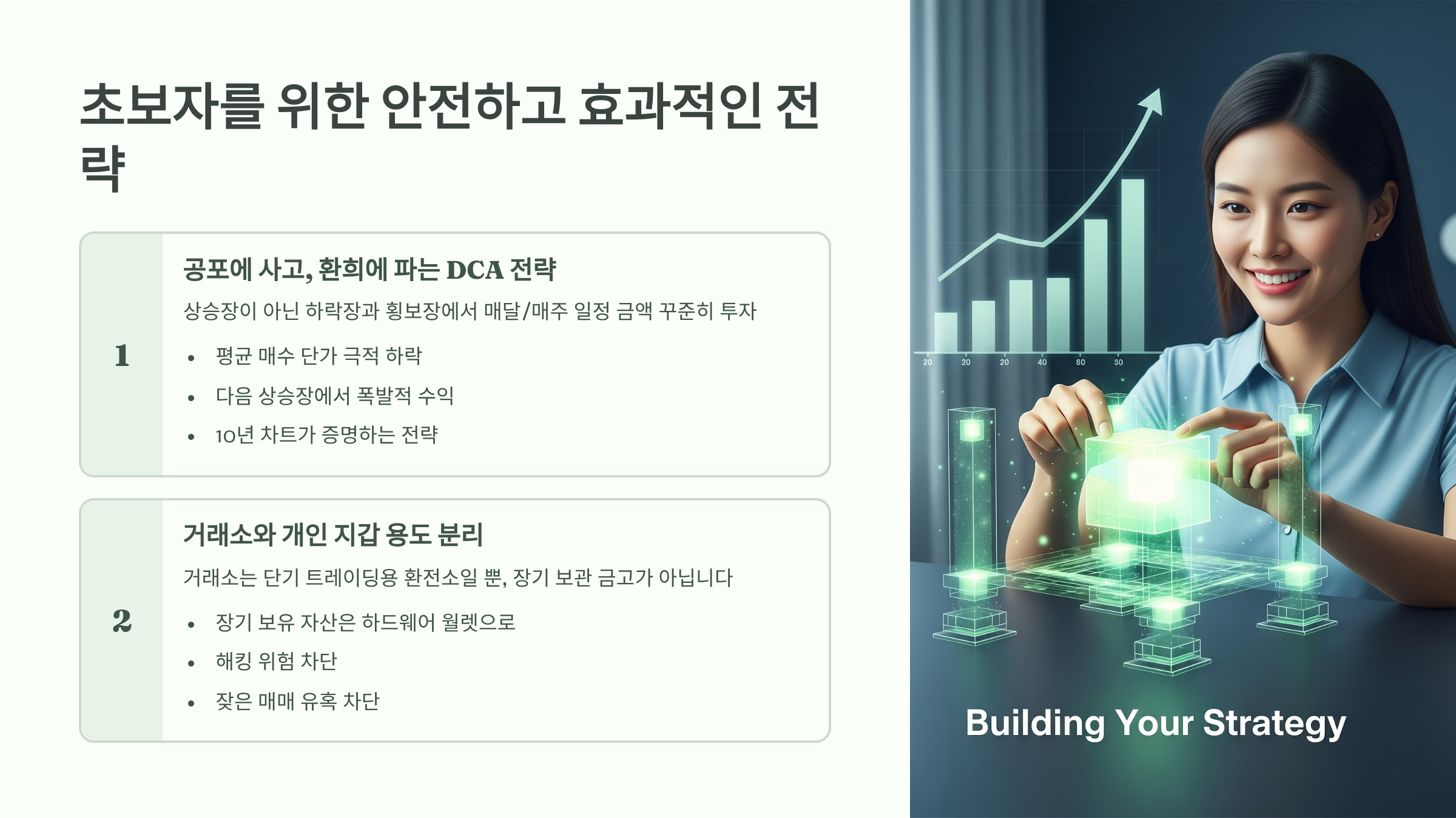 - 실행 방법: 장기 보유할 자산은 반드시 하드웨어 월렛과 같은 개인 지갑으로 옮겨 보관하는 원칙을 세우세요. 이는 해킹의 위험으로부터 자산을 보호할 뿐만 아니라, 잦은 매매의 유혹에서 벗어나 장기적인 관점을 유지하게 해주는 심리적 안전장치 역할을 합니다.