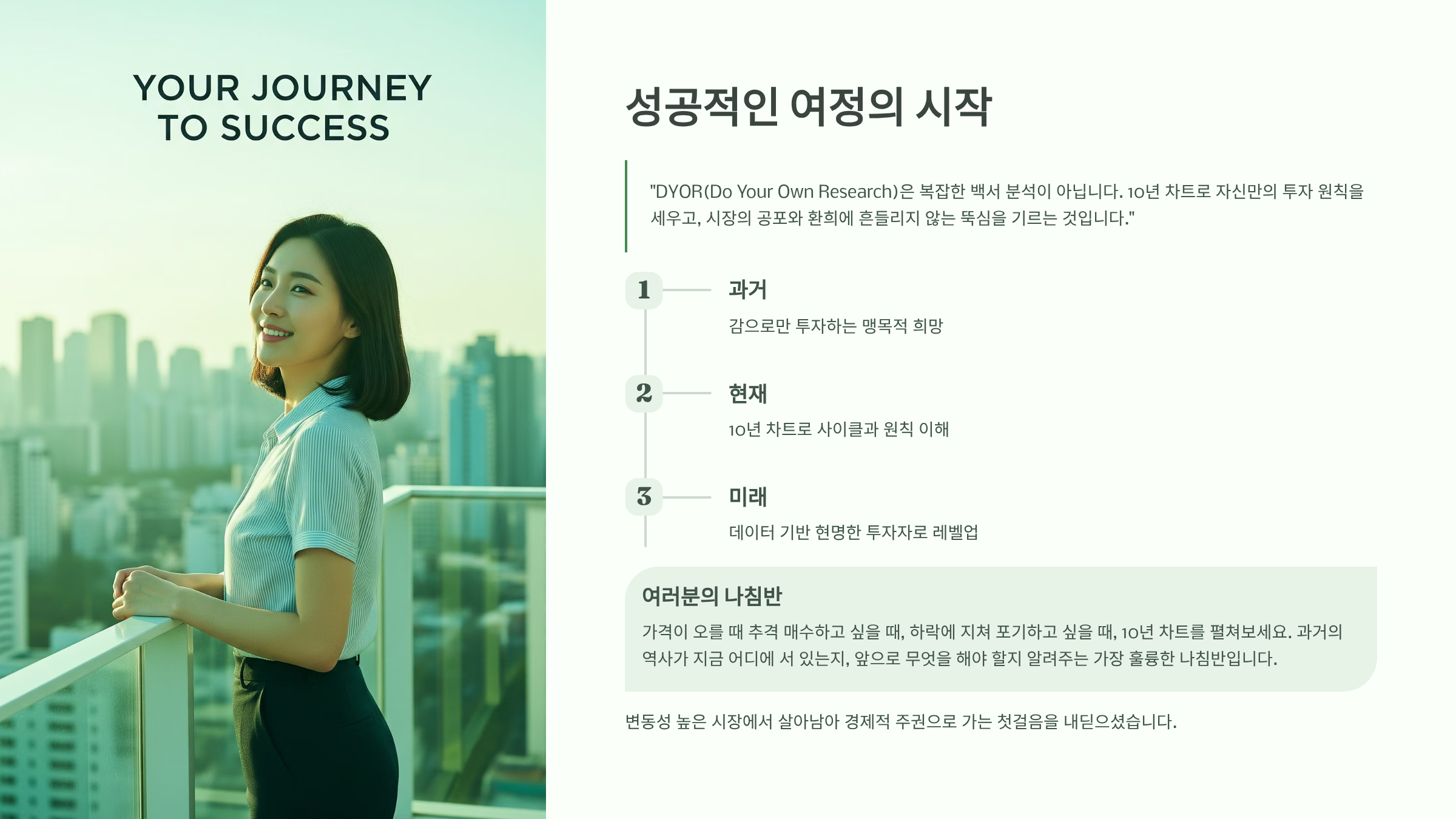 흔히들 말하는 'DYOR(Do Your Own Research)'은 복잡한 백서를 분석하라는 뜻이 아닙니다. 오늘 우리가 함께 배운 10년 차트 분석을 통해 자신만의 투자 원칙을 세우고, 시장의 공포와 환희에 흔들리지 않는 뚝심을 기르는 과정이야말로 '진짜' 리서치입니다. 가격이 오를 때 추격 매수하고 싶을 때, 하락에 지쳐 모든 걸 포기하고 싶을 때, 이 10년 차트를 펼쳐보세요. 과거의 역사가 여러분이 지금 어디에 서 있는지, 그리고 앞으로 무엇을 해야 할지를 알려주는 가장 훌륭한 나침반이 되어줄 것입니다.
