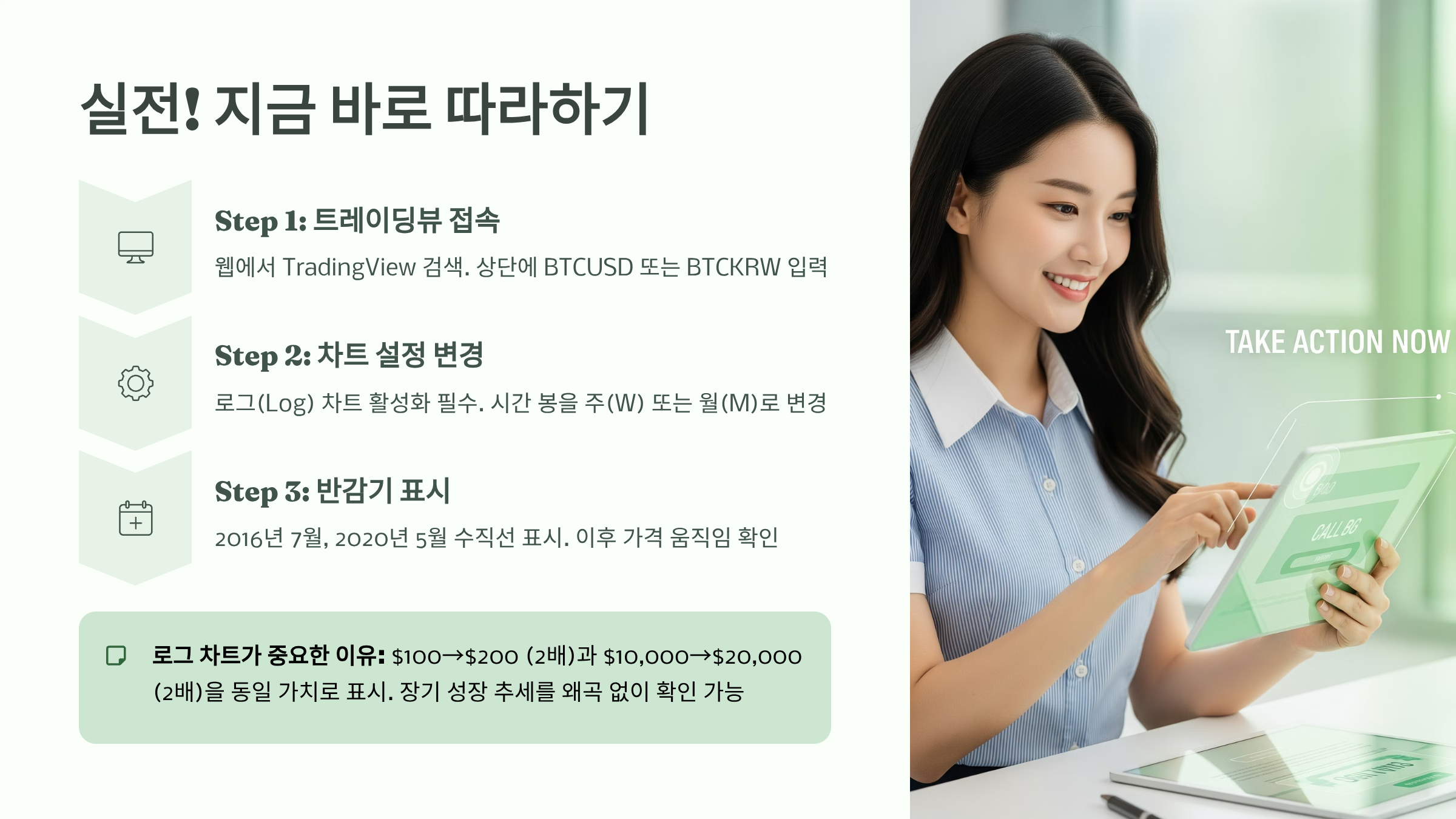 - 로그(Log) 차트 설정: 차트 우측 하단 가격 축에 있는 'log' 버튼을 반드시 활성화하세요. 일반 차트는 가격 변화 '폭'을, 로그 차트는 '비율'을 보여줍니다. $100에서 $200로 오르는 것(2배)과 $10,000에서 $20,000로 오르는 것(2배)을 동일한 가치로 보여주기 때문에, 장기적인 성장 추세를 왜곡 없이 볼 수 있습니다.