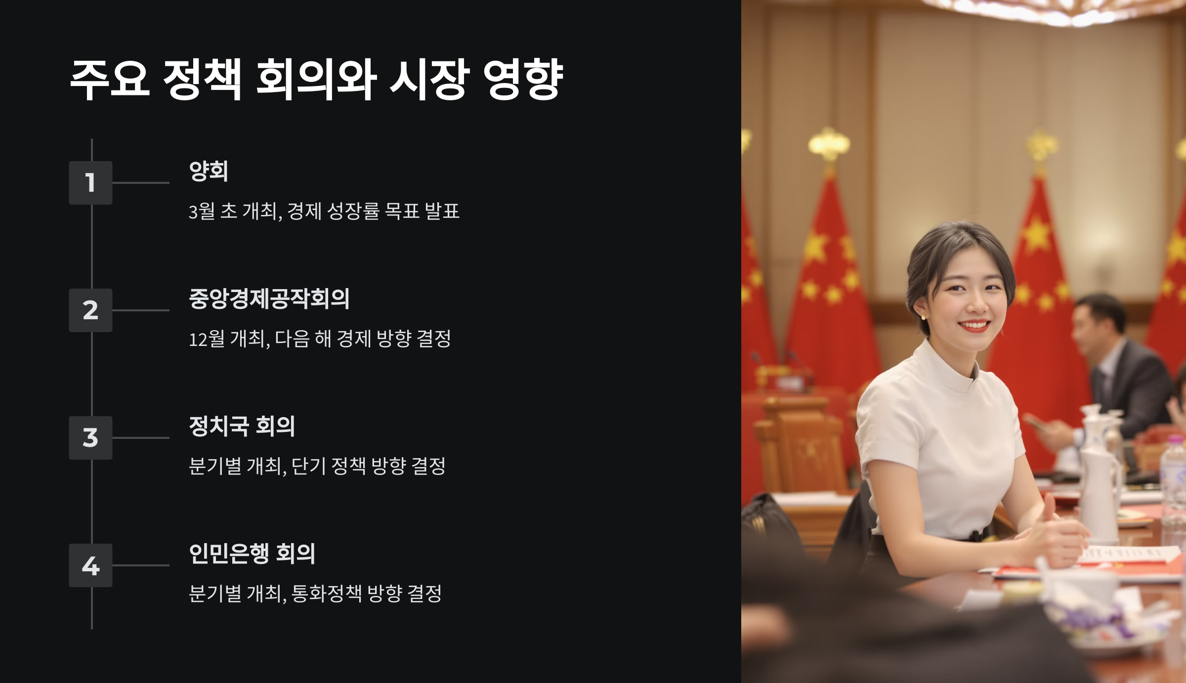 - 고위 관료 발언 모니터링: 시진핑 주석, 리창 총리 등 최고 지도부뿐만 아니라, 인민은행 총재, 재정부장, 국가발전개혁위원회(NDRC) 주임 등 경제 부처 핵심 관료들의 공개 발언 내용을 주시해야 합니다. 특정 발언이 반복되거나 강조될 경우, 해당 내용이 곧 정책으로 구체화될 가능성이 높습니다.