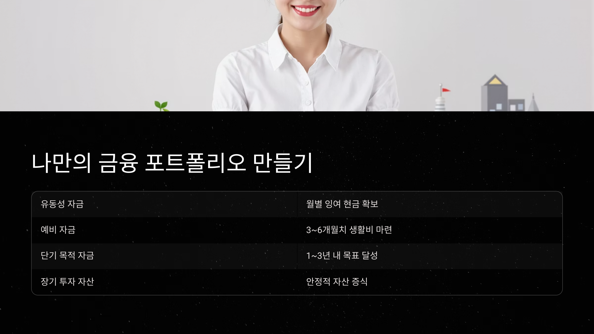 - 5. 목표 비중 설정: 예를 들어 30대 직장인이라면 '단기 10%, 중기 30%, 장기 60%'와 같이 자신의 상황에 맞는 목표 비중을 설정합니다. 이후 월급날이나 분기별로 자산을 재배치하여 이 비중을 유지하려는 노력이 필요합니다.