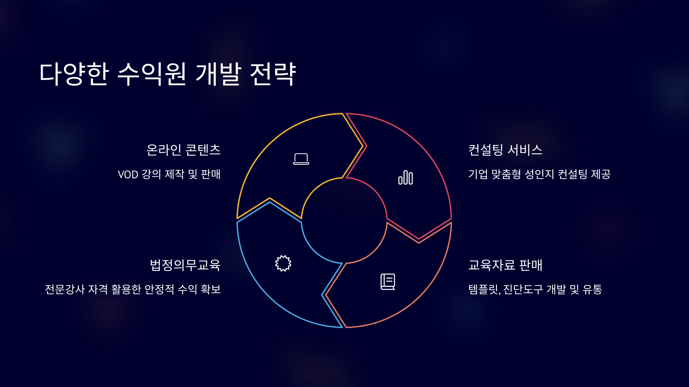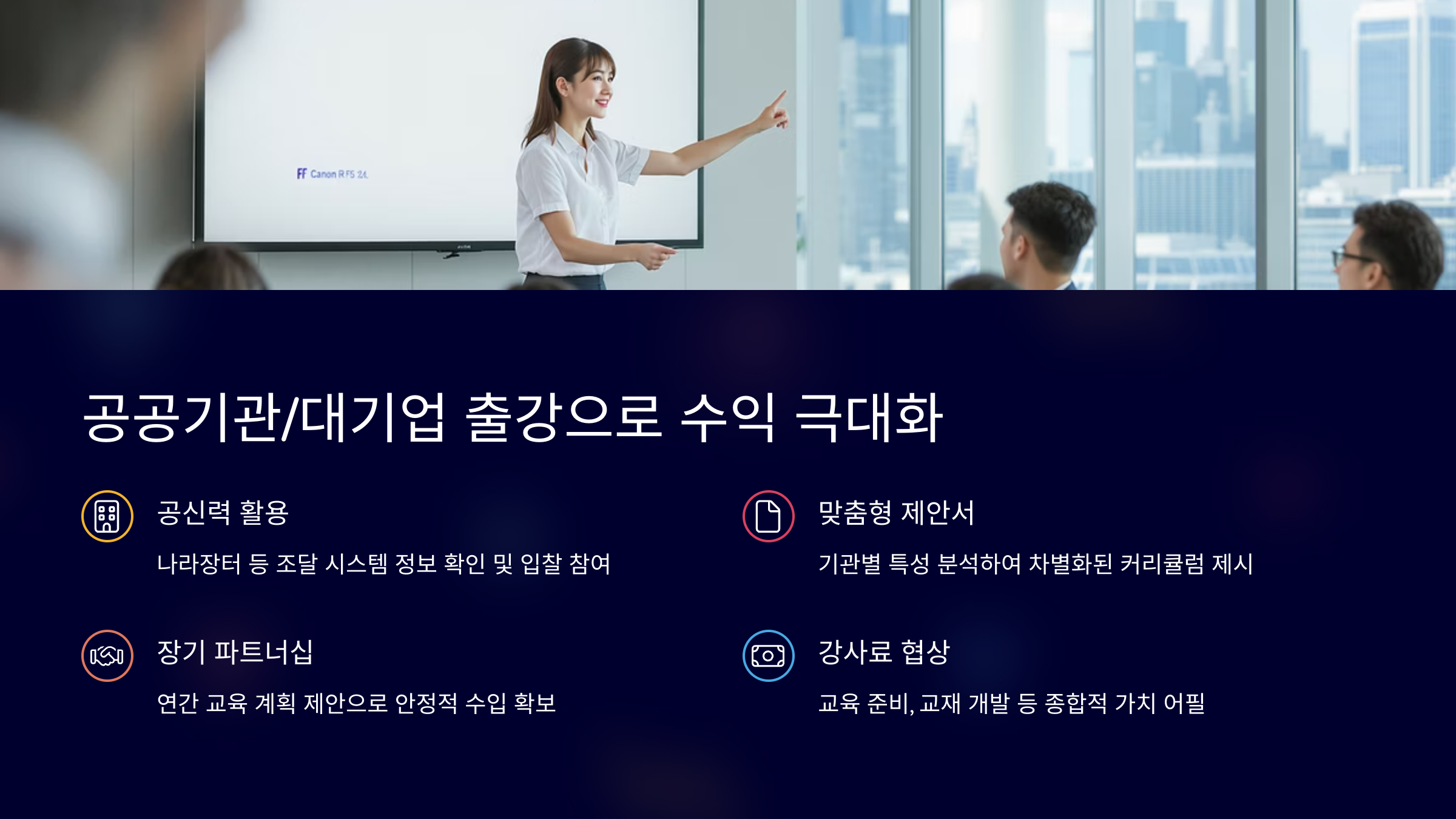 | 수익 극대화 전략 | 다수 기관 대상 반복 계약, 연간 교육 계획 제안, 정부 지원 사업 연계 | 고부가가치 심화 과정, 리더십 교육, 컨설팅 연계, 장기 파트너십 |