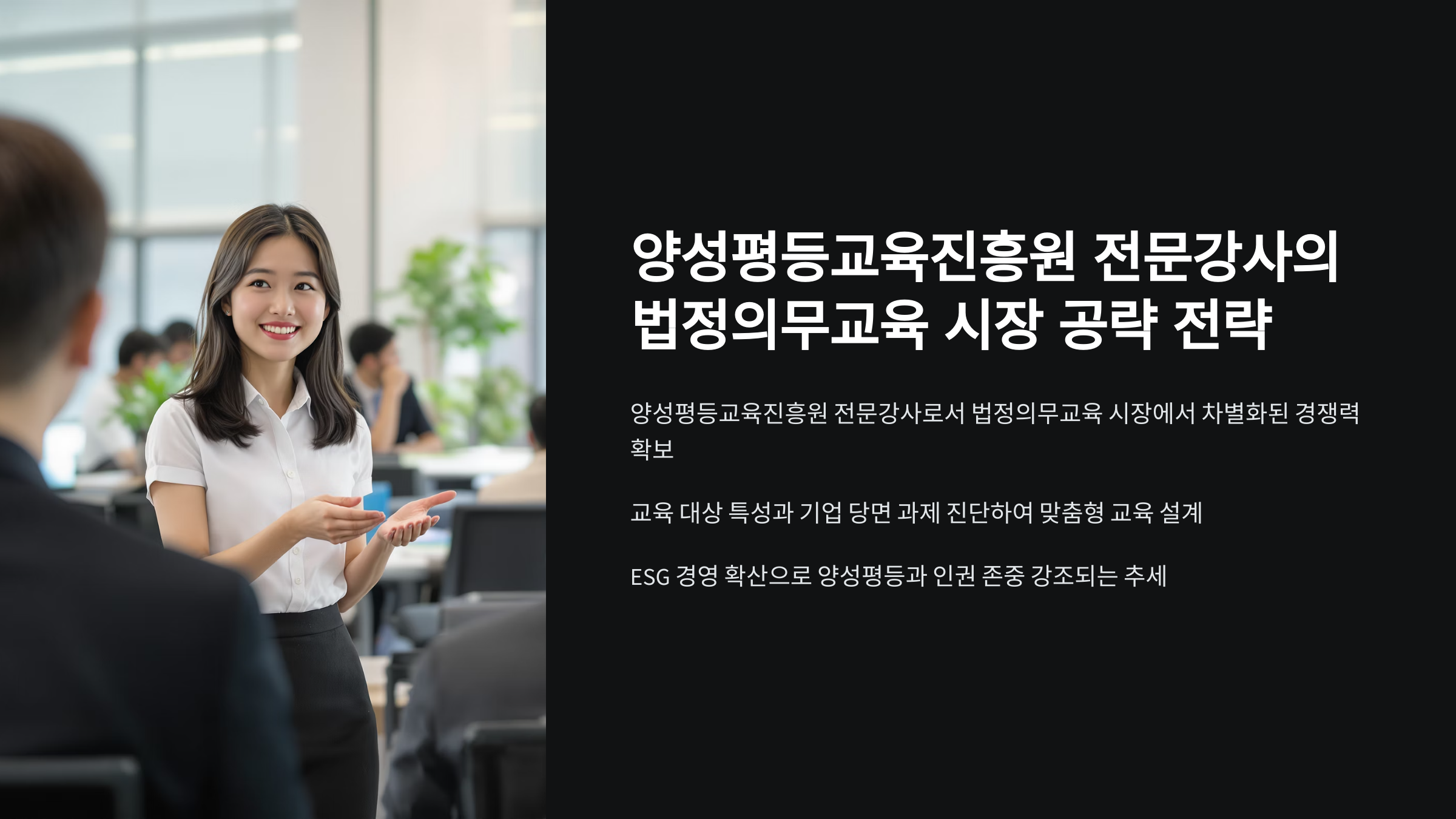 대기업은 ESG 경영 강화, 조직 내 다양성 및 포용성 증진, 법적 리스크 관리 차원에서 양성평등 교육에 대한 투자를 확대하는 추세입니다. 양성평등교육진흥원 전문강사로서 대기업 시장을 공략하기 위해서는 기업의 특성과 니즈를 정확히 파악하고, 차별화된 가치를 제공해야 합니다.