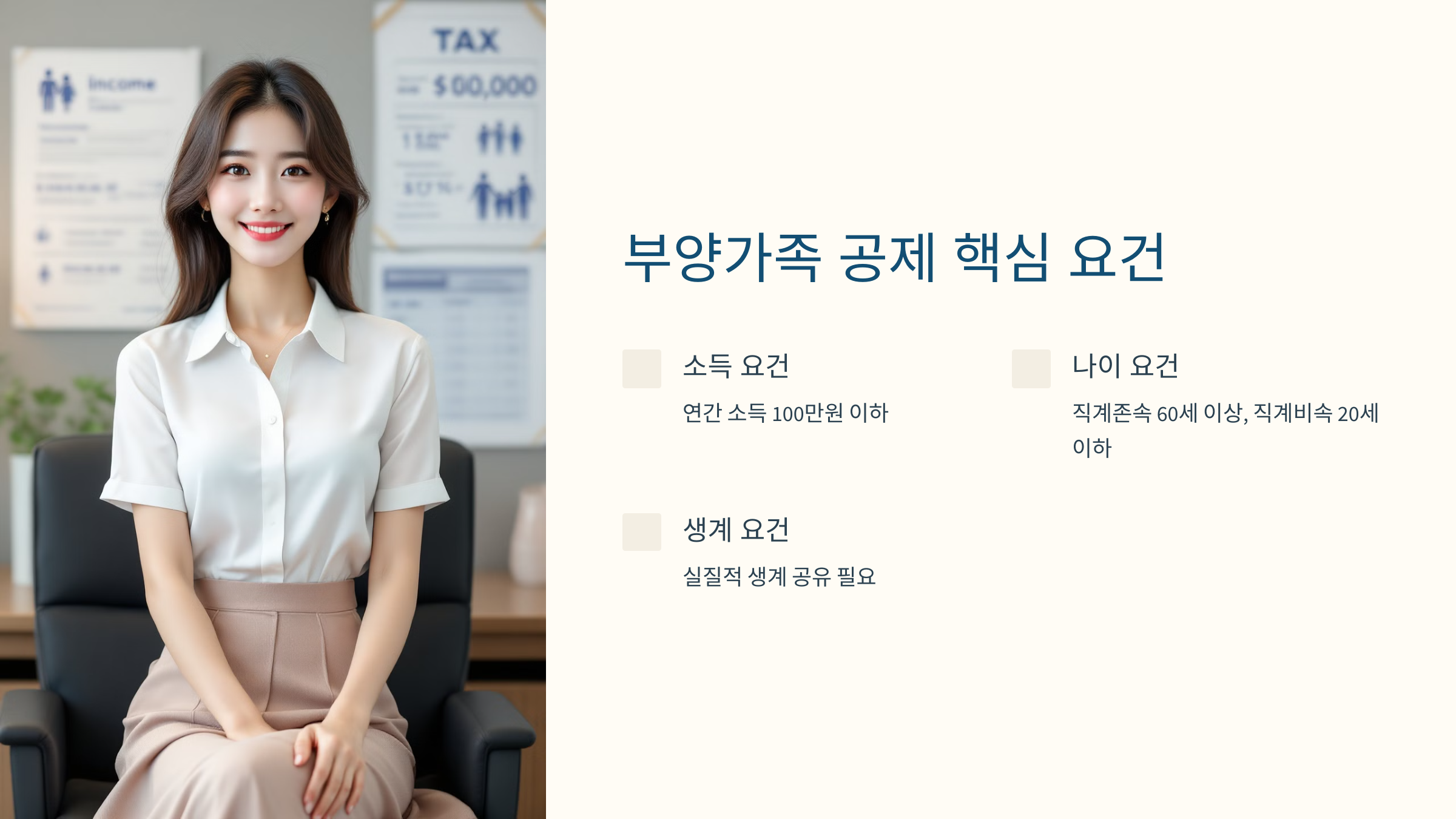 | 직계존속 | 부모, 조부모 등 | 연간 소득 100만원 이하 | 만 60세 이상 | 동거 또는 실질적 생계 유지 |