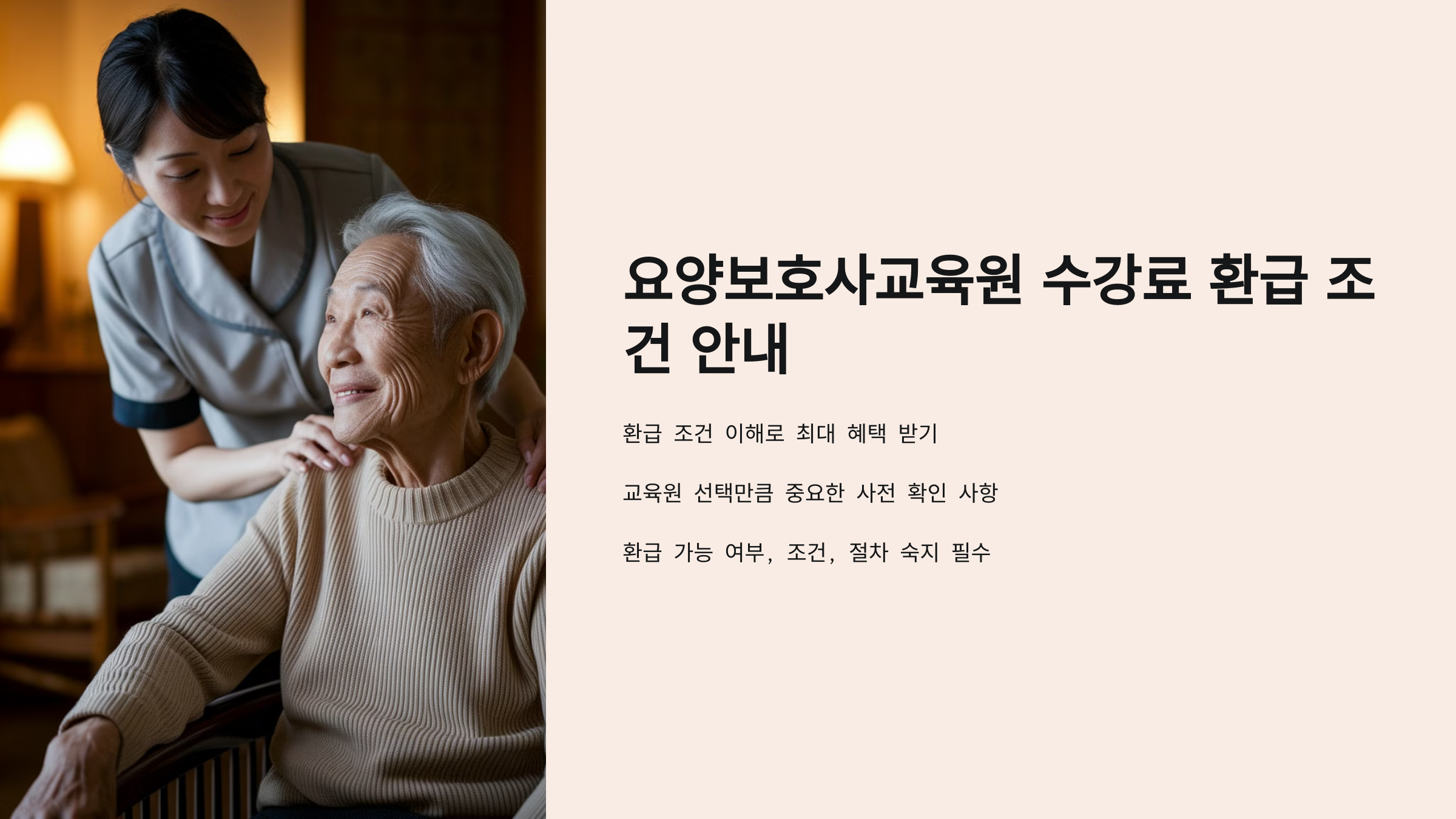 요양보호사교육원 수강료 환급, 이것만 확인하세요! 요양보호사 교육을 받으려는 분들이 가장 궁금해하는 수강료 환급에 대한 모든 것을 명쾌하게 정리했습니다. 이 글에서는 복잡한 환급 조건들을 쉽게 이해하고, 실제로 환급을 받을 수 있도록 핵심 정보와 놓치기 쉬운 세부 사항들을 꼼꼼하게 안내해 드립니다.