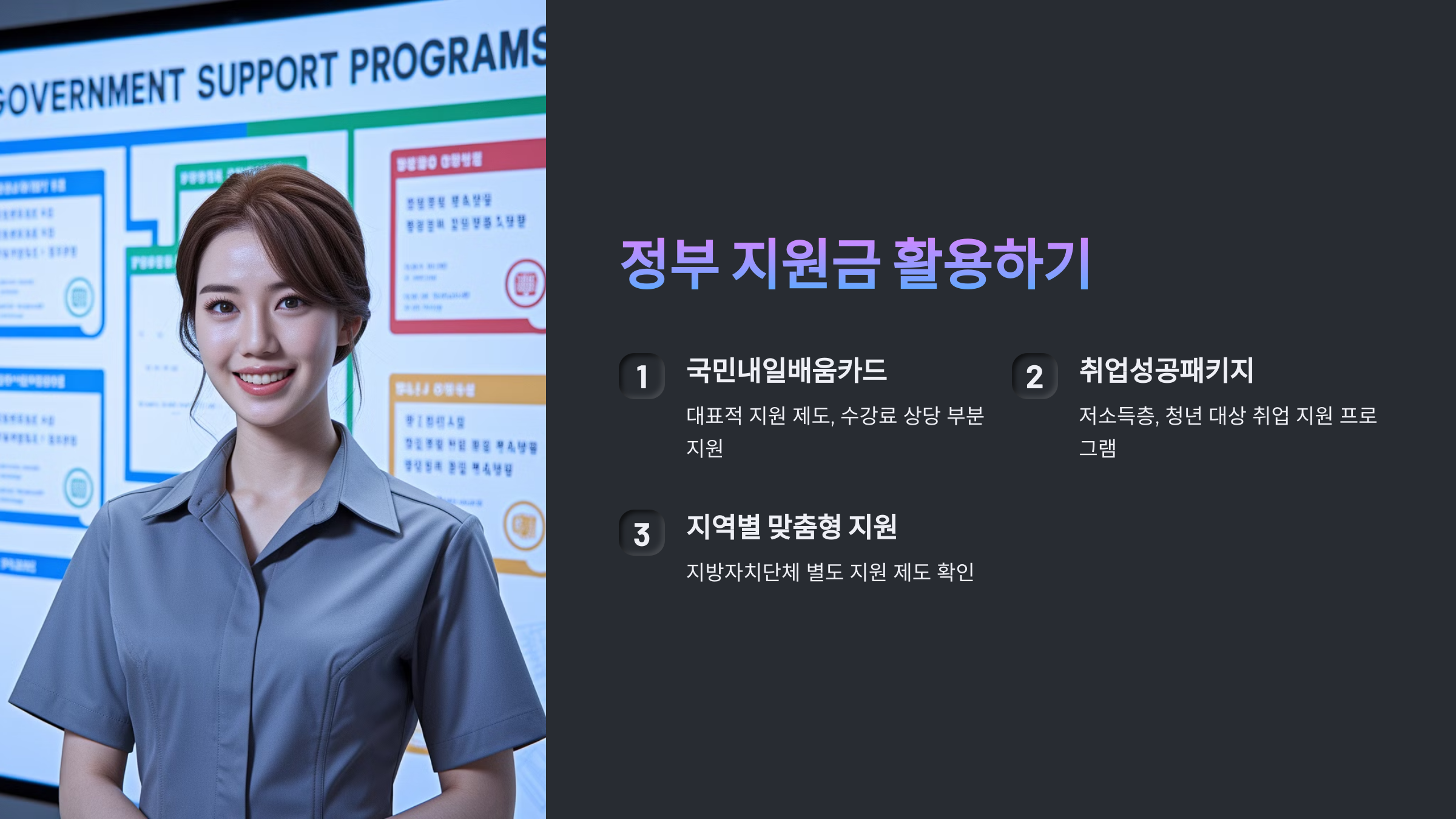 - 정부 지원금 활용: 국민내일배움카드 외에도 정부에서 제공하는 다양한 교육 지원금을 활용할 수 있습니다. 예를 들어, 저소득층 자녀 교육비 지원, 청년 구직 활동 지원금 등이 있습니다.