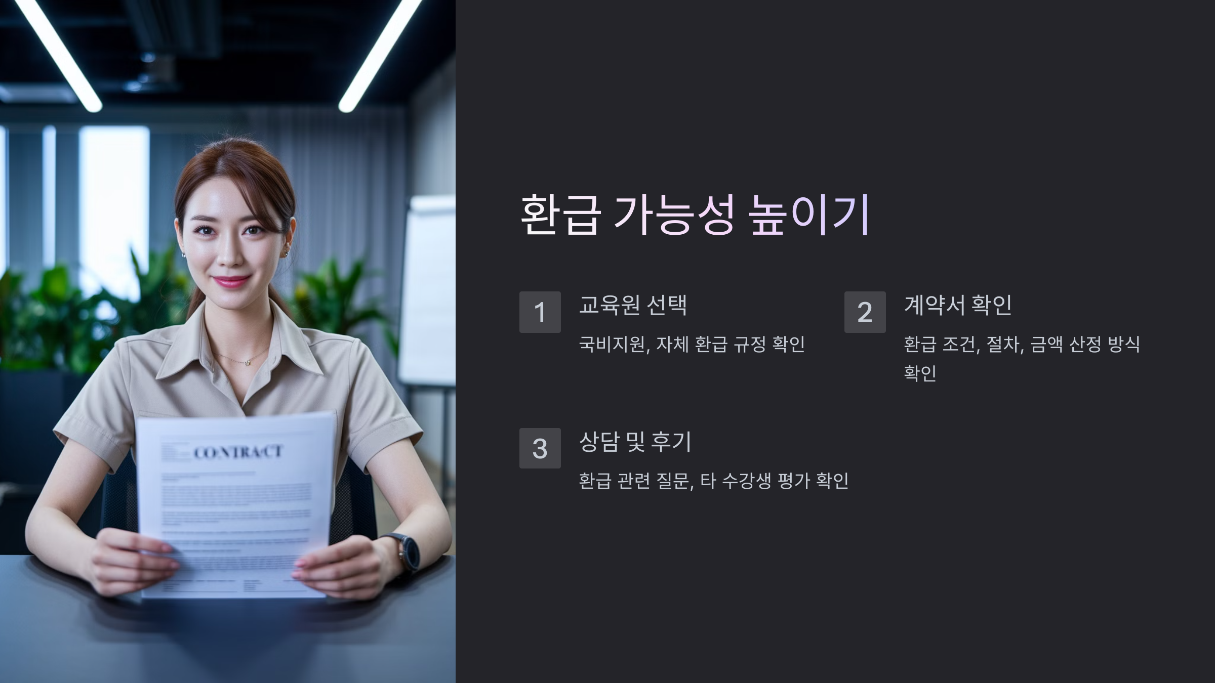 - 환급 규정 숙지: 교육원의 환급 규정을 꼼꼼히 숙지하고, 환급 가능 조건과 절차를 정확히 이해해야 합니다.