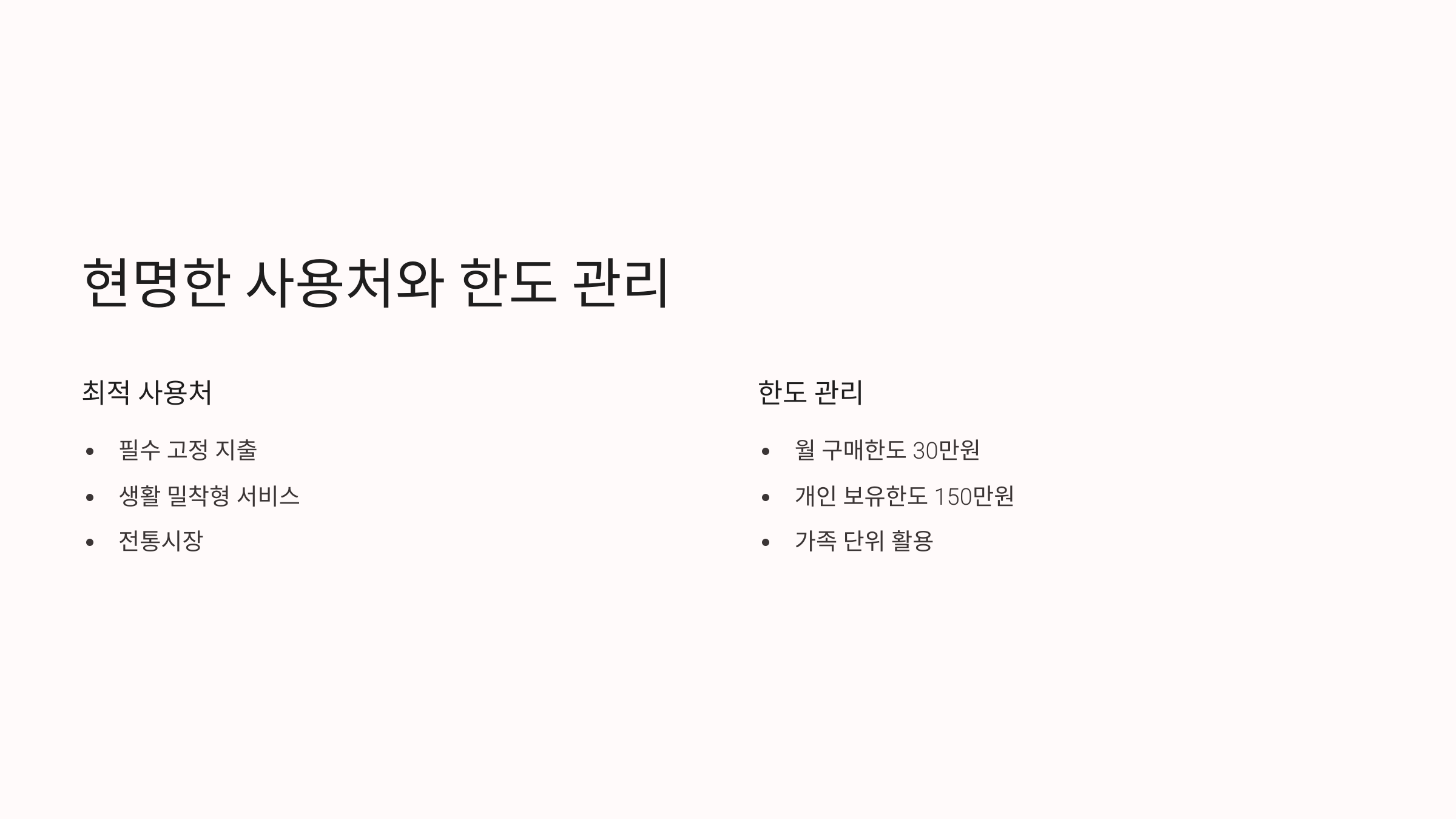 | 개인 보유한도(150만원) 관리 | 개인별 최대 보유한도(현재 150만원)를 초과하면 추가 구매가 불가능하므로, 소비 계획에 맞춰 적절히 사용하며 잔액을 관리합니다. | 필요시 즉시 추가 구매가 가능하도록 유동성 확보. 장기간 미사용 시 기회비용 발생. | 정기적 잔액 확인 필요. |