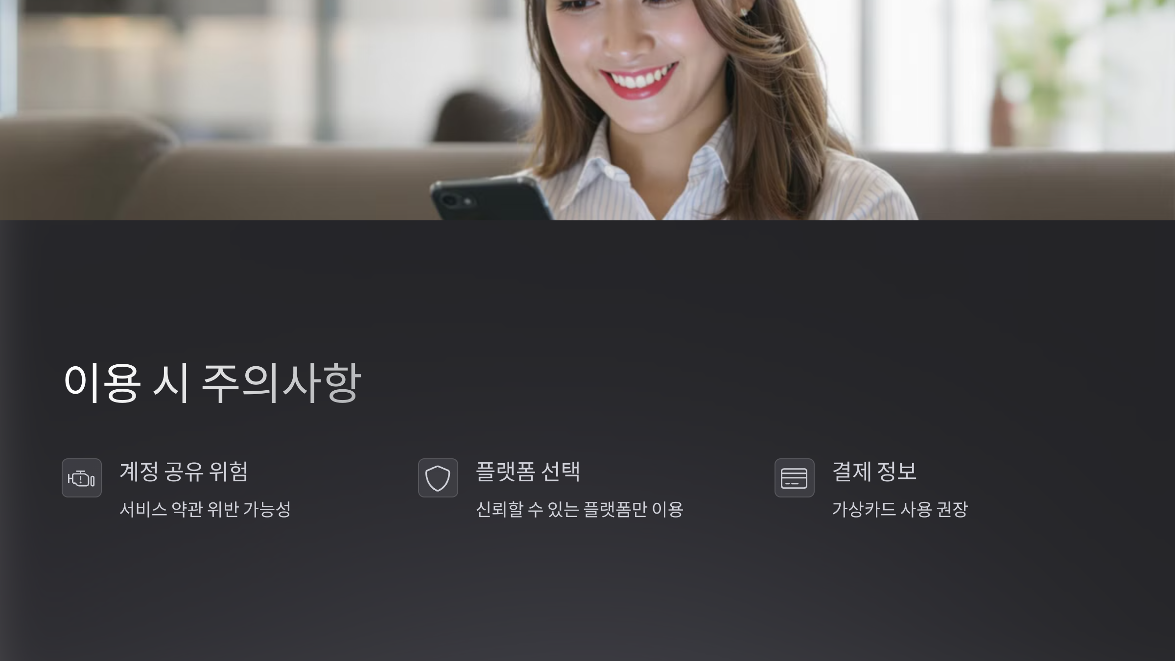 - 가능하면 가족이나 친구 등 신뢰할 수 있는 사람들과 직접 계정을 공유하는 것이 가장 안전합니다.