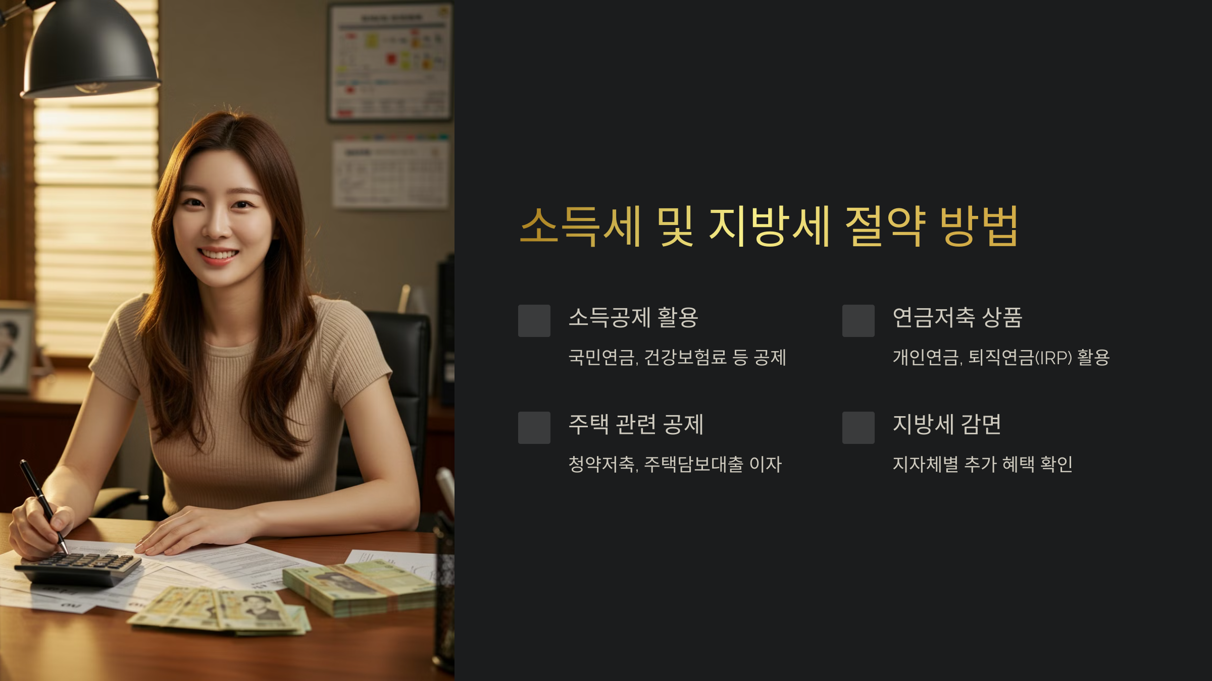 | 지방세 절약 | 소득세 절약 연동 및 지자체 감면 활용 | 소득세 절약 전략 활용, 지자체별 감면 혜택 확인, 신용카드 할부 및 포인트 활용 |