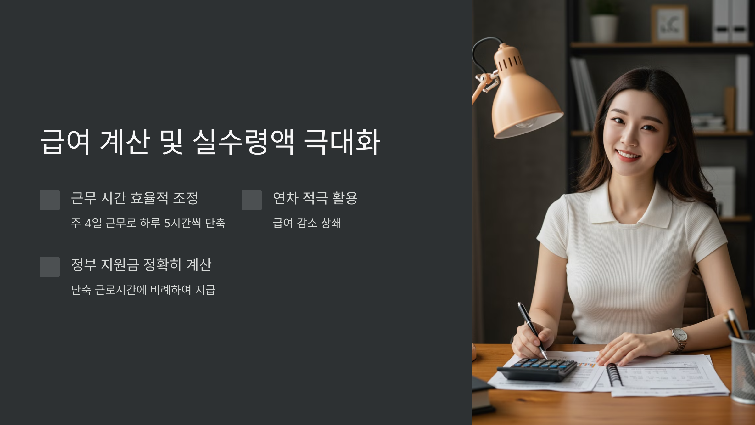 | 실수령액 | 단축 급여 + 정부 지원금 - 세금 | 세금 공제 후 실제 수령액, 연차 활용 등 고려 |