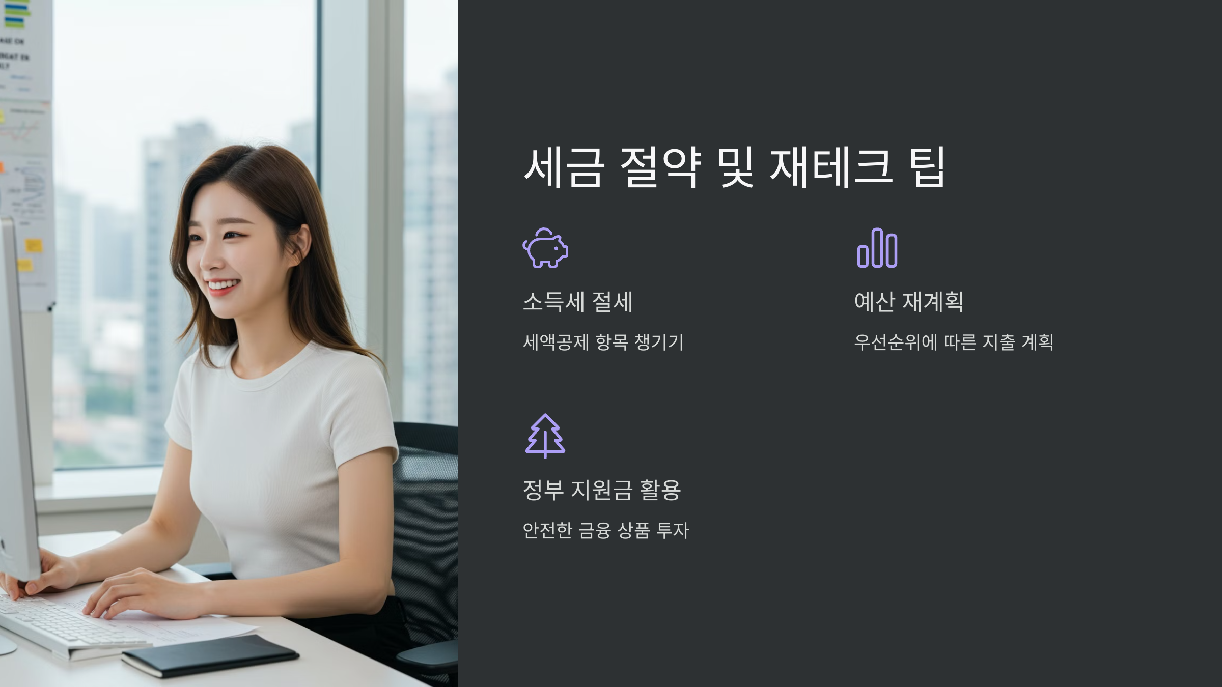 | 소득세 절약 | 소득공제 및 세액공제 활용 | 연금저축, 퇴직연금, 주택청약저축 활용, 의료비, 교육비 등 세액공제 챙기기 |
