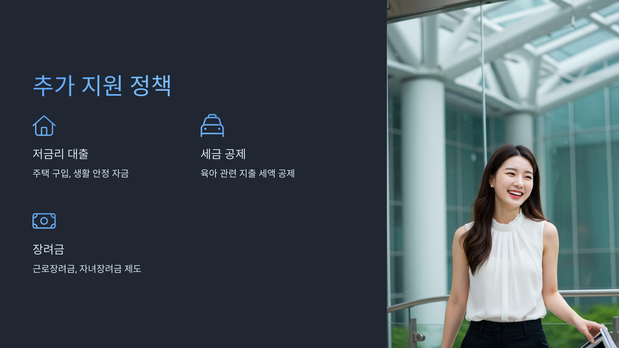 | 정책 자금 | 저금리 대출 | 주택 구입 자금, 생활 안정 자금 등 |