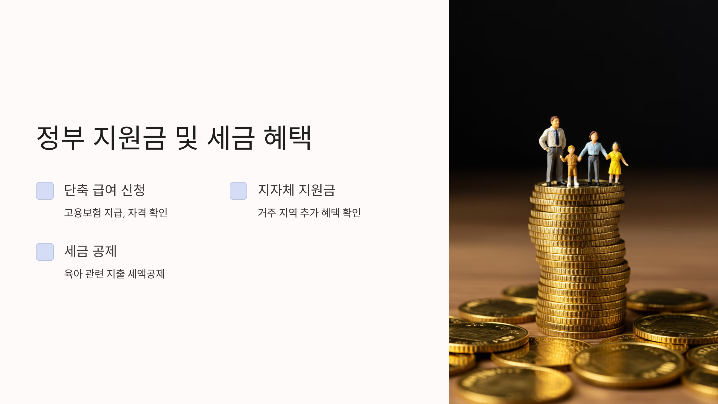 | 정부 지원금 | 정부 지원금 및 세금 혜택 극대화 | 육아기 근로시간 단축 급여 신청, 지자체 육아 지원금 확인, 소득세 및 지방세 공제 |