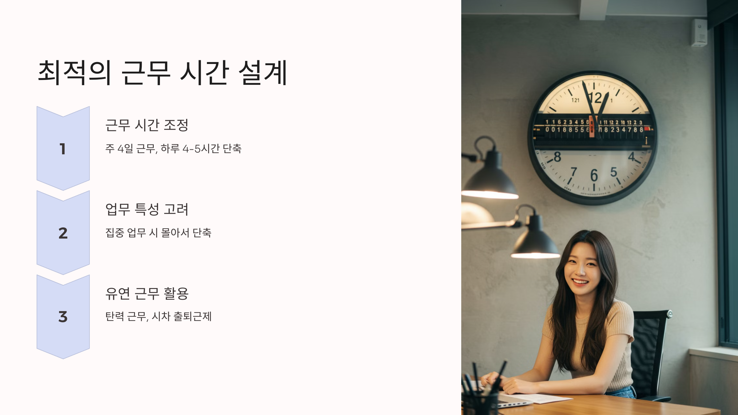 | 근무 시간 | 최적의 단축 근무 시간 설계 | 주 4일 근무, 업무 특성 고려, 유연 근무 활용 |