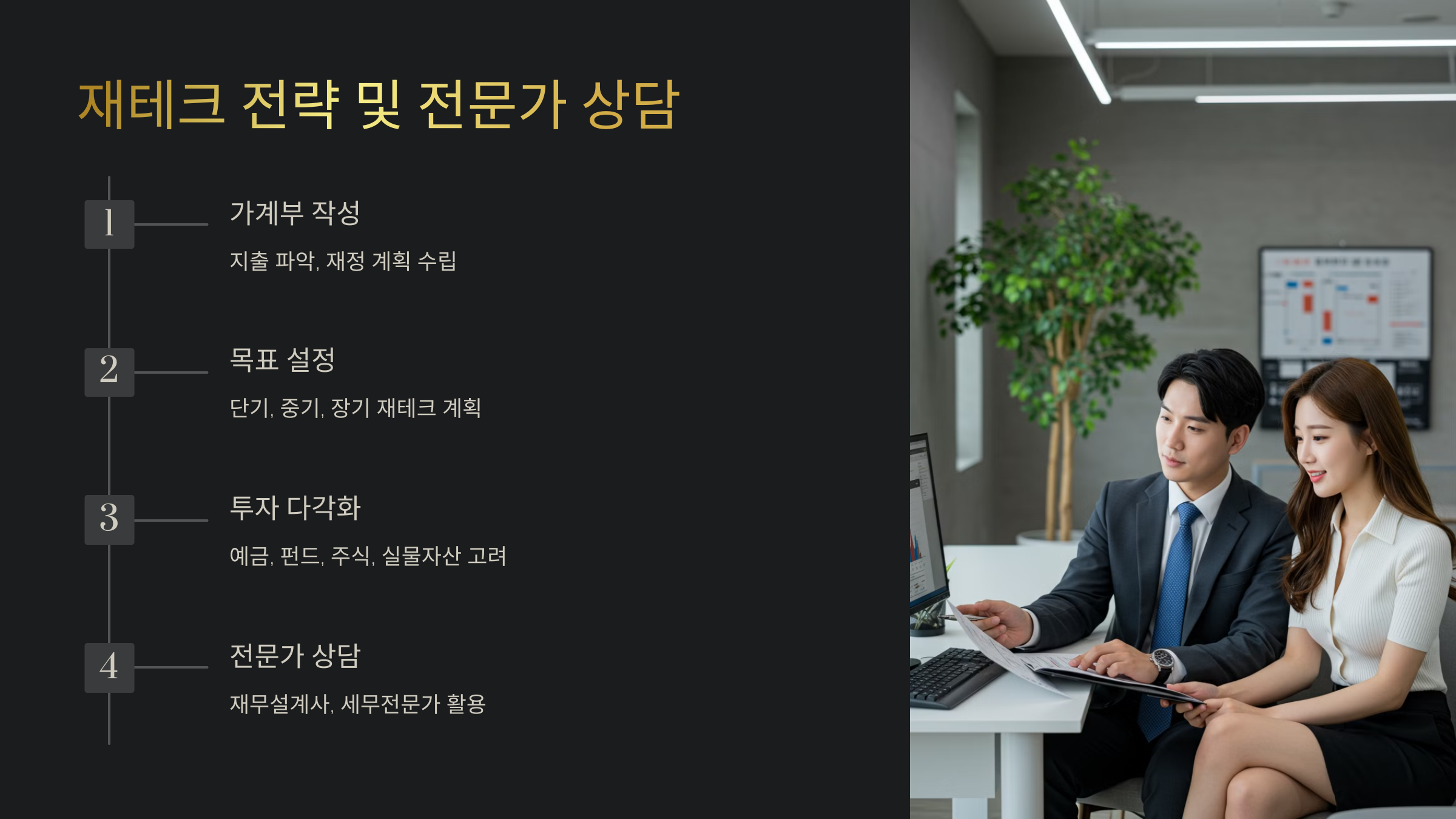 | 추가 팁 | 세금 우대 금융 상품 활용 및 실물 자산 투자 고려 | ISA, 비과세 저축 상품 활용, 부동산, 금 등 실물 자산 투자 |