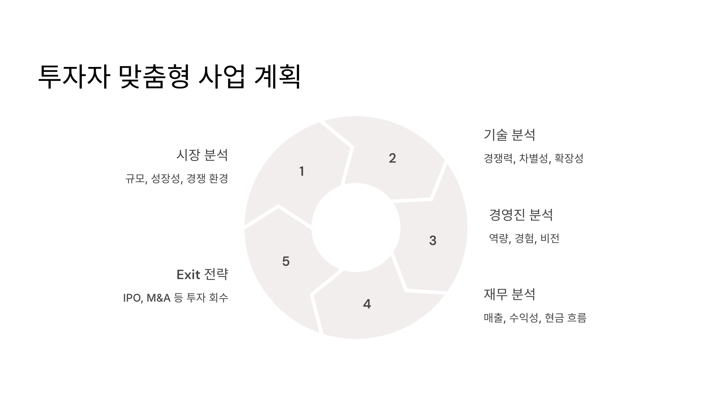- Exit 전략 제시: IPO, M&A 등 투자 회수 전략 제시