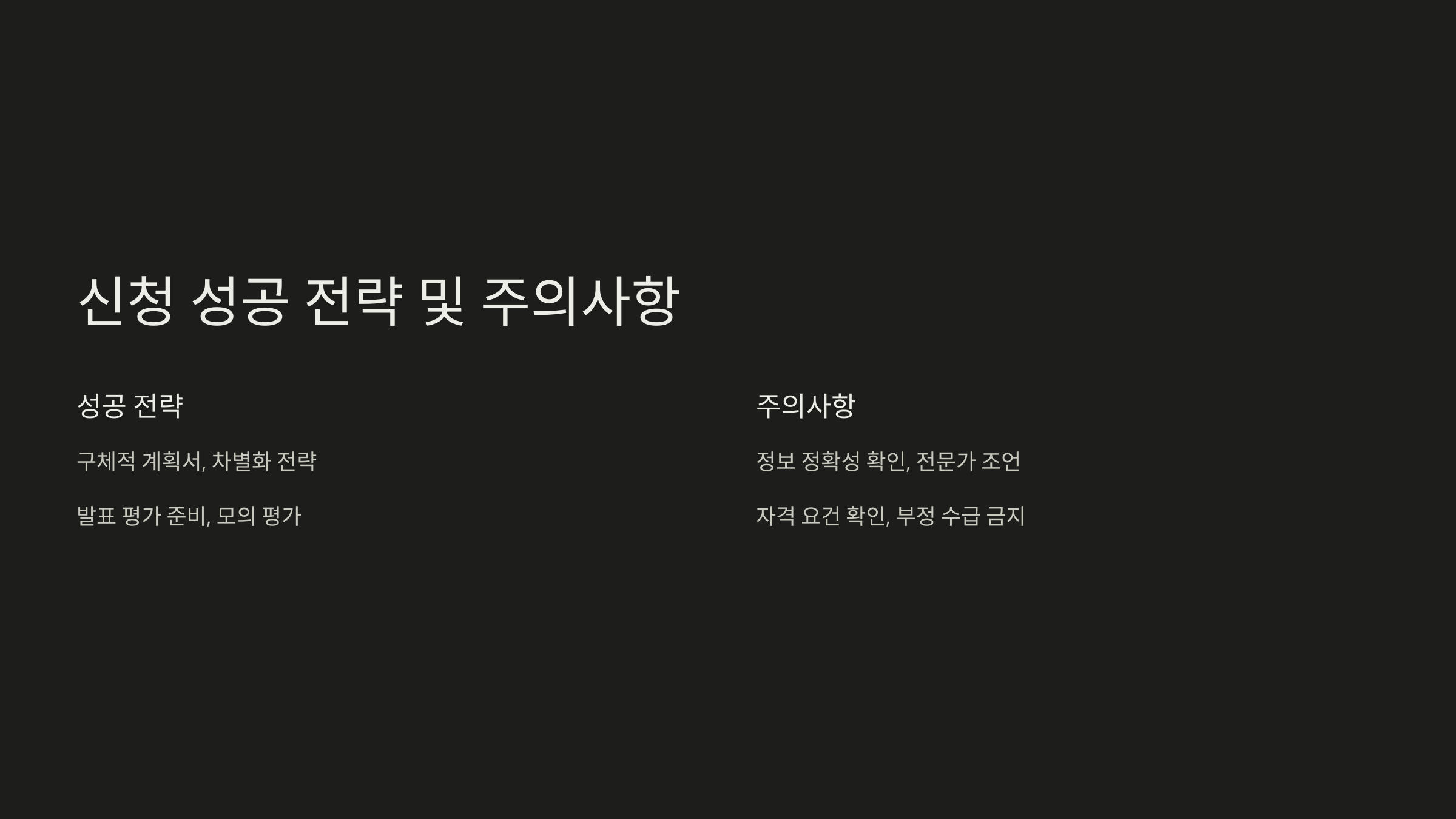 - 정책 방향 부합: 정부 정책 방향에 맞는 사업 아이템 개발 및 사업 계획 반영
