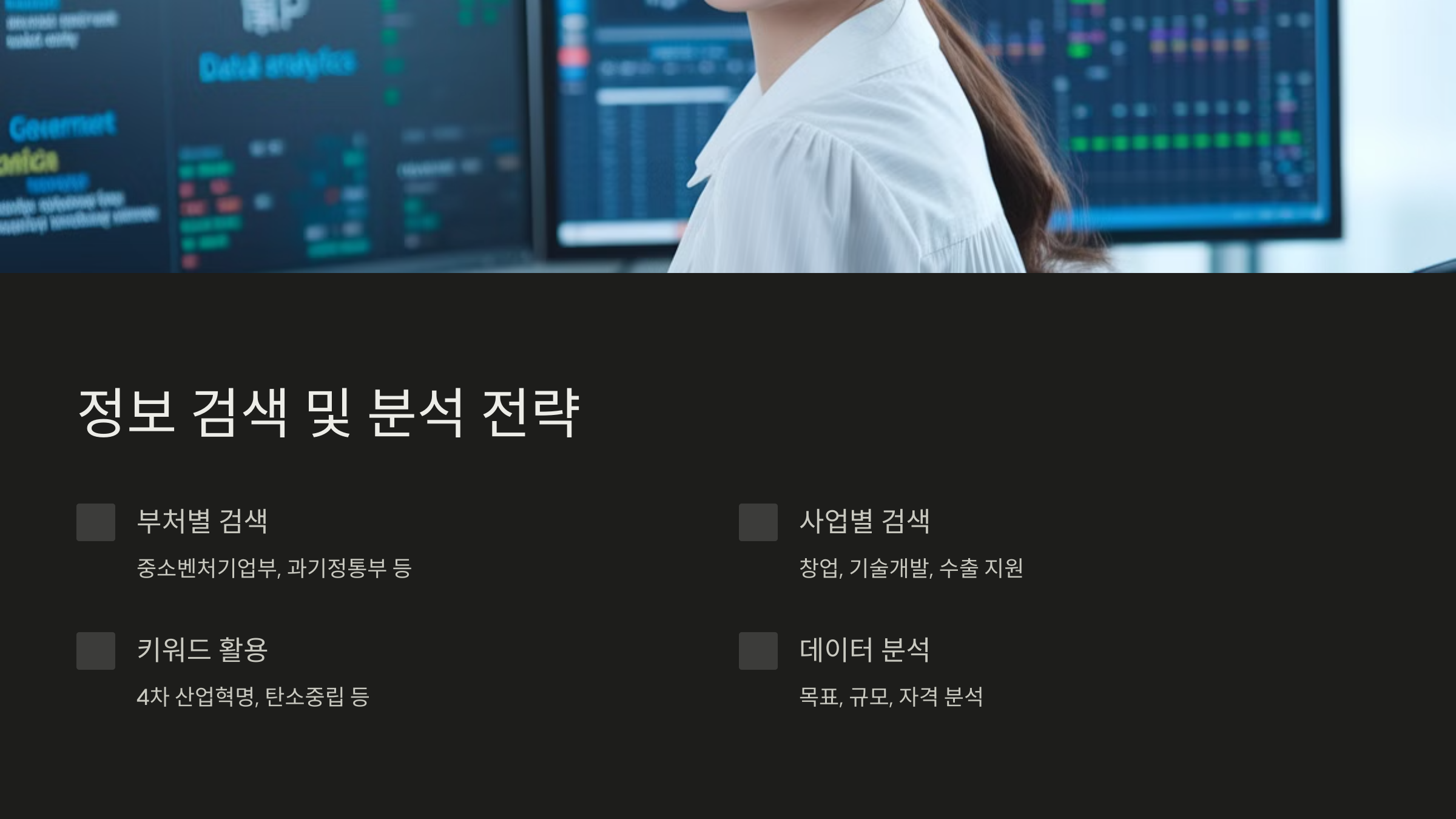 - 정부 부처별 검색: 중소벤처기업부, 과학기술정보통신부, 산업통상자원부 등 관련 부처 검색