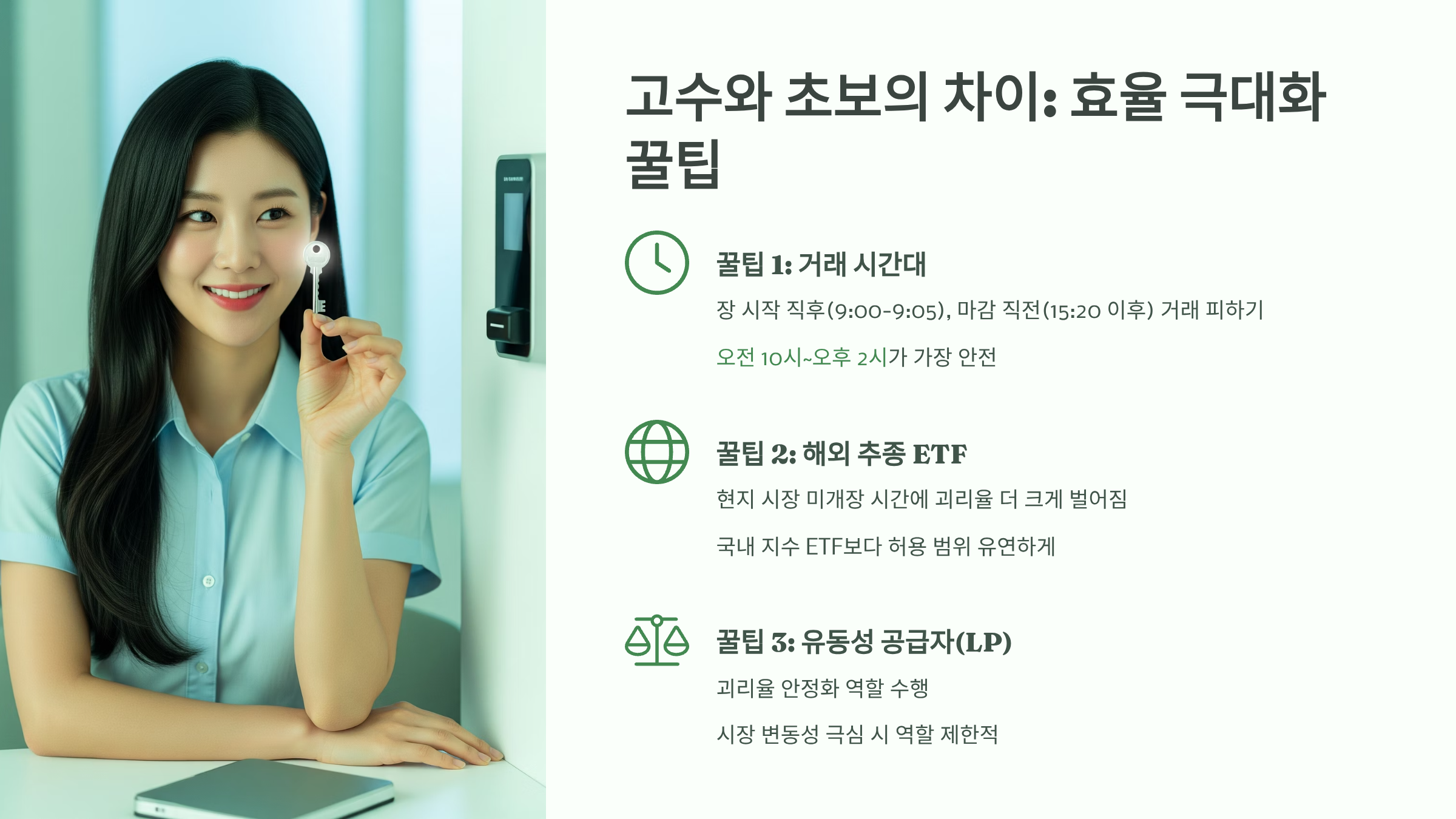 미국이나 중국 등 해외 지수를 추종하는 ETF는 현지 시장이 열리지 않는 시간에 거래될 때 괴리율이 더 크게 벌어지는 경향이 있습니다. 이는 자연스러운 현상이므로, 국내 지수 추종 ETF보다 괴리율 허용 범위를 조금 더 유연하게 생각해야 합니다. - 꿀팁 3: 유동성 공급자(LP)의 역할을 이해하세요.
