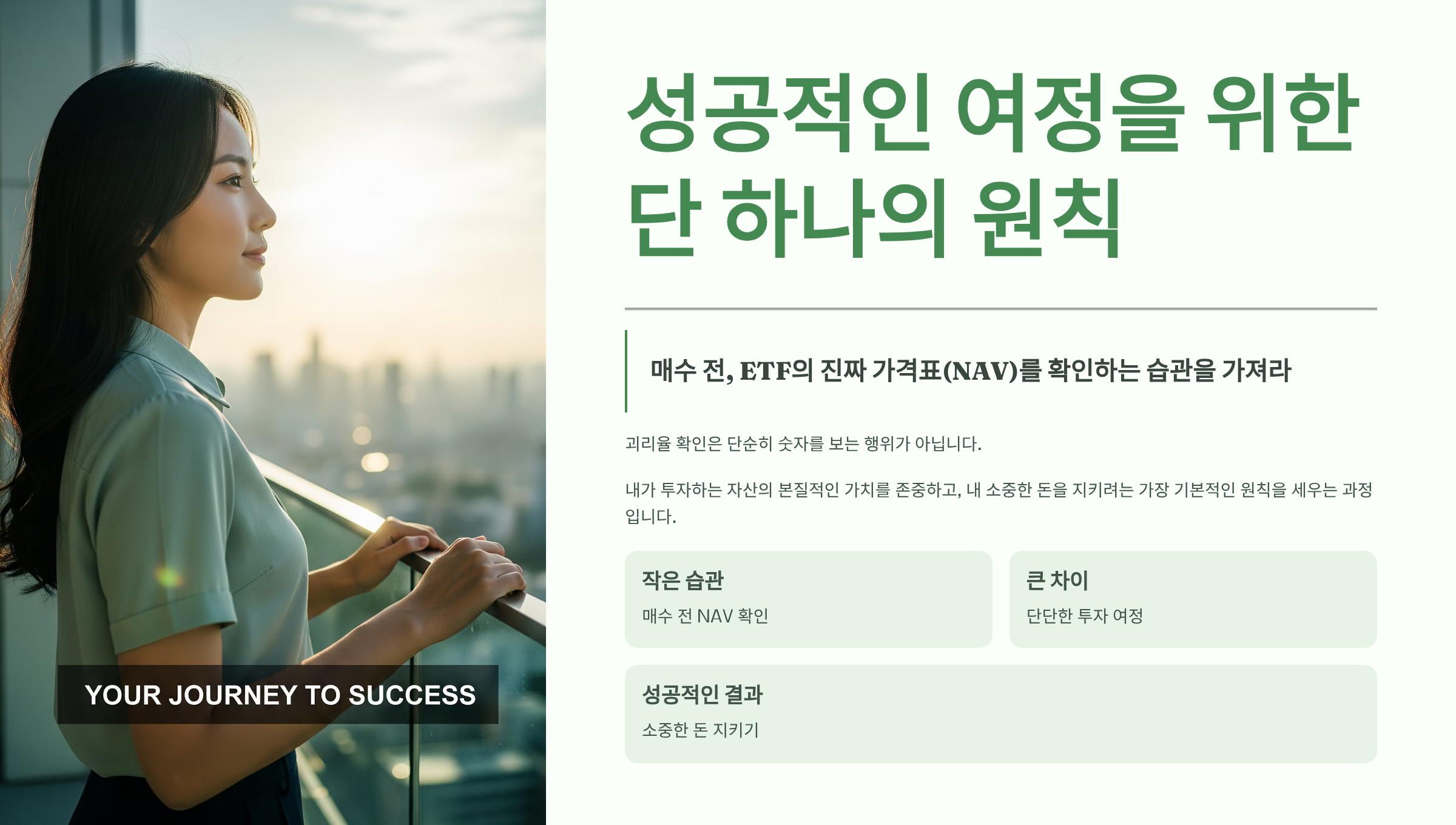 지금까지 ETF 괴리율의 모든 것을 파헤쳐 보았습니다. 복잡해 보였을지 모르지만, 모든 것을 관통하는 성공의 마지막 퍼즐 조각이자 단 하나의 원칙은 이것입니다.
