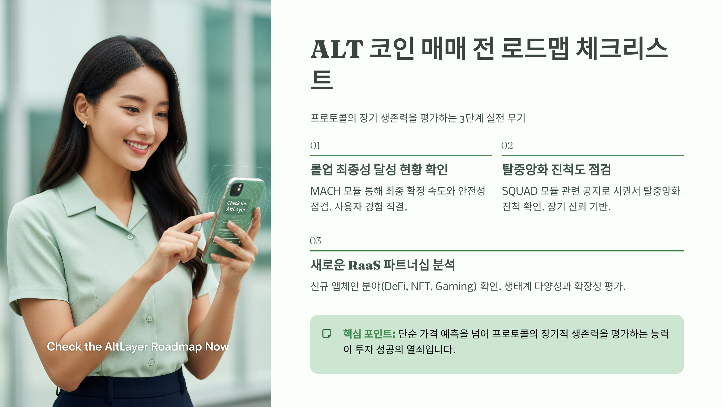 복잡한 기술 분석은 전문가에게 맡기더라도, 여러분은 알트레이어가 어떤 로드맵을 따라가고 있는지 판단할 수 있어야 합니다. 다음의 3단계 체크리스트를 지금 바로 따라 해보세요.