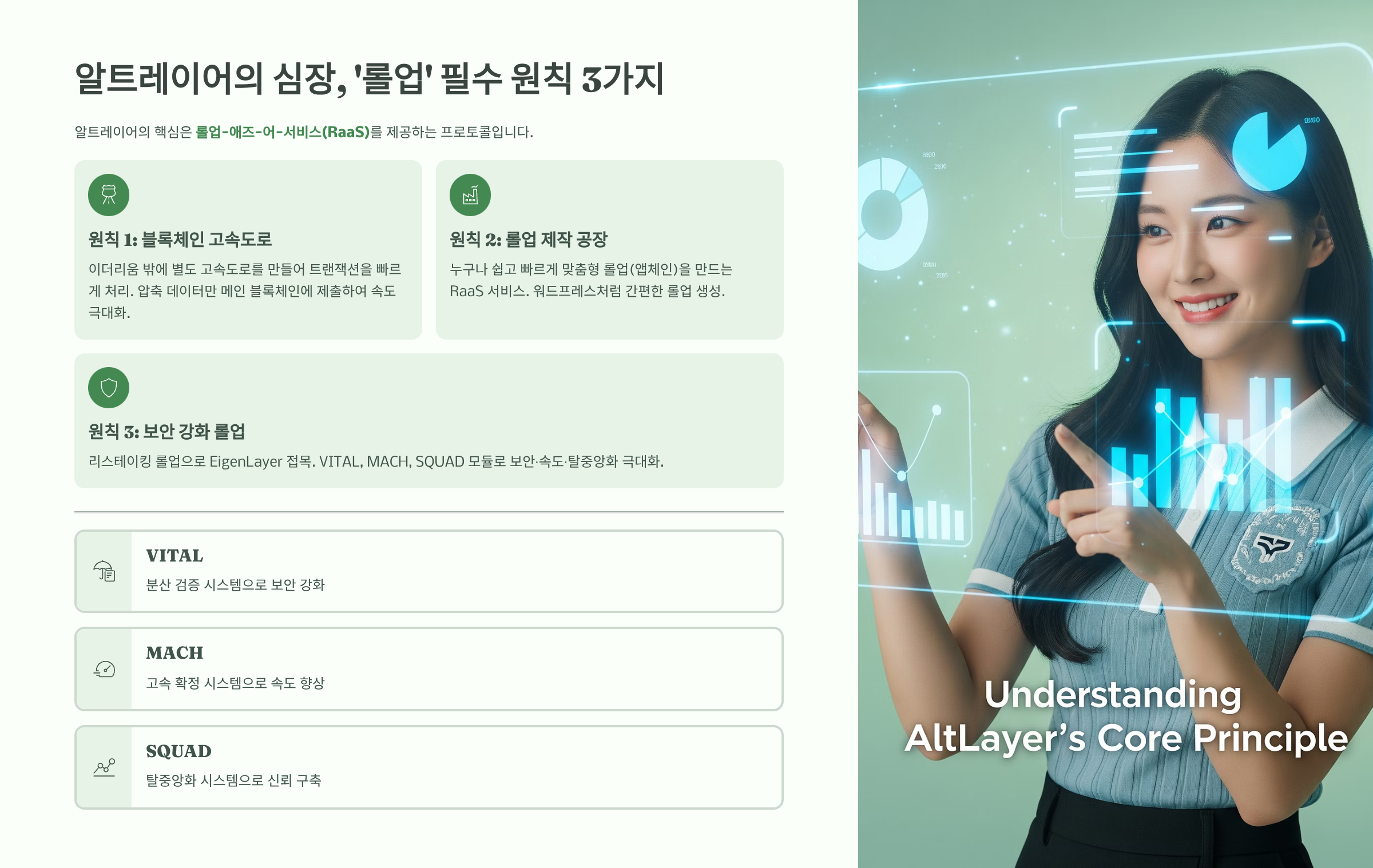 알트레이어의 핵심은 롤업-애즈-어-서비스(RaaS, Rollup-as-a-Service)를 제공하는 프로토콜입니다. 복잡한 기술을 모두 잊고, 이 필수 원칙 3가지만 기억하십시오.