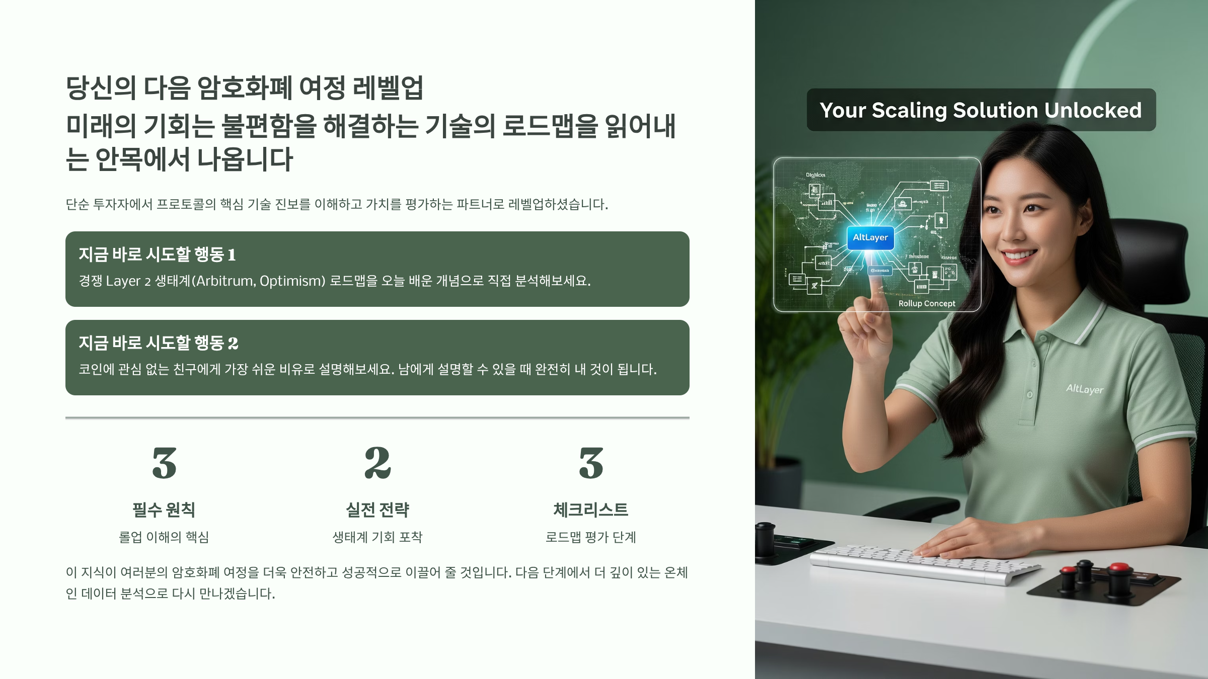 우리는 이 글을 통해 알트레이어의 '롤업'이라는 복잡한 기술이 사실은 이더리움의 확장성 문제를 해결하는 가장 실용적이고 강력한 미래를 여는 열쇠임을 확인했습니다. 더 이상 막연한 두려움 때문에 새로운 기회를 놓치는 일은 없을 것입니다.
