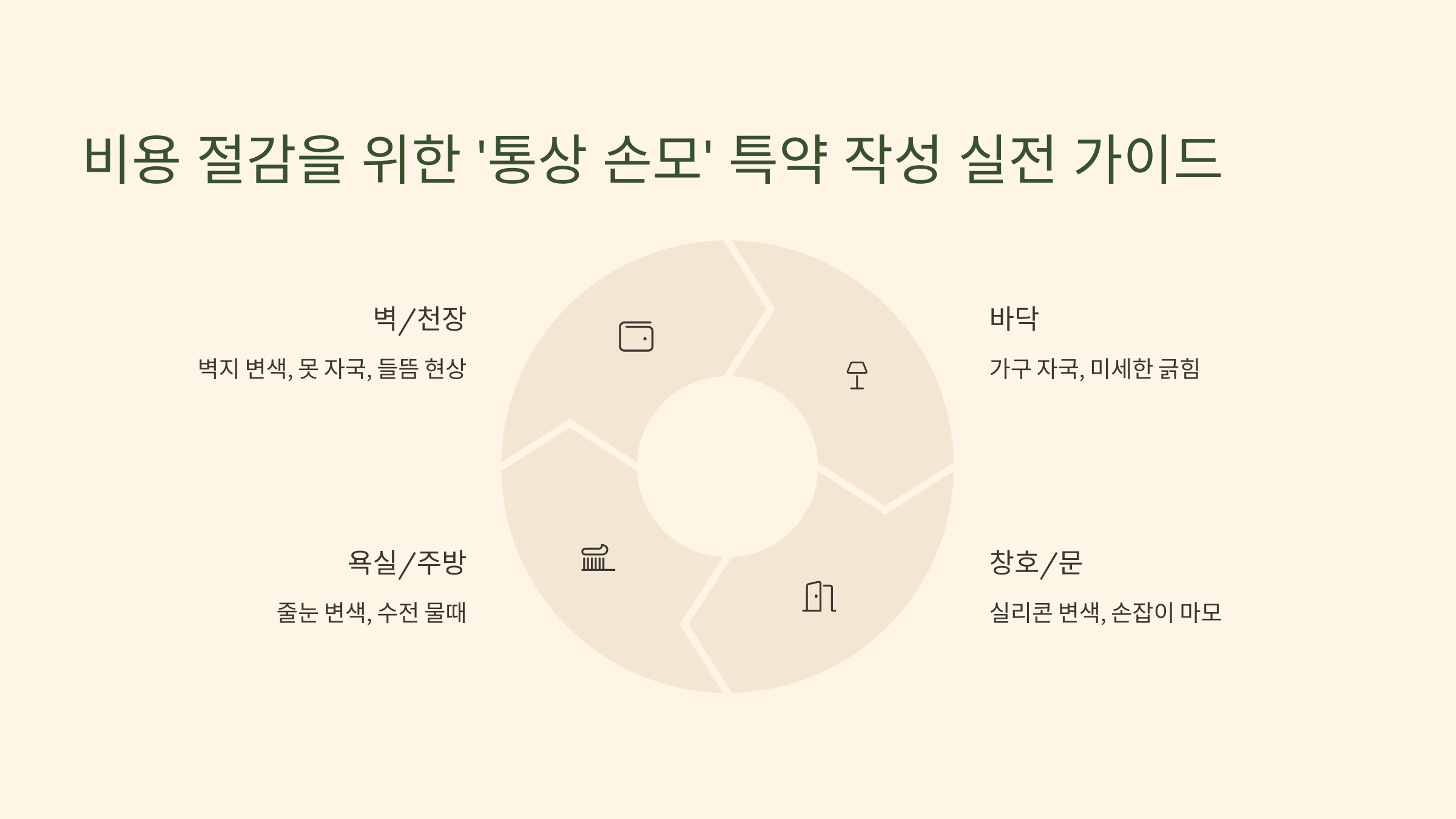 | 벽지 | 햇빛에 의한 변색, 생활 때, 가구/액자 뒤 자국 | 낙서, 찢어짐, 애완동물로 인한 훼손, 흡연으로 인한 심한 변색/냄새 | 입주 시 상태 사진 촬영, 특약에 '통상 못 자국 허용' 명시, 감가상각(내용연수) 고려 주장 |