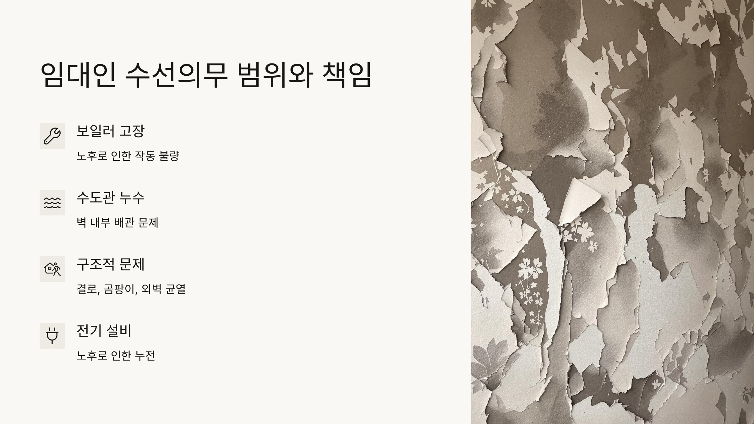 임대차 계약 기간 중 발생한 문제 중 일부는 임차인의 원상복구 의무가 아닌, 임대인의 '수선의무' 범위에 해당할 수 있습니다. 임대인은 임차인이 임대차 목적물을 계약 내용에 따라 사용·수익하는 데 필요한 상태를 유지하게 할 의무를 부담합니다 (민법 제623조). 이는 특히 건물의 주요 구성 부분이나 기본적 설비의 노후 또는 파손에 해당합니다.