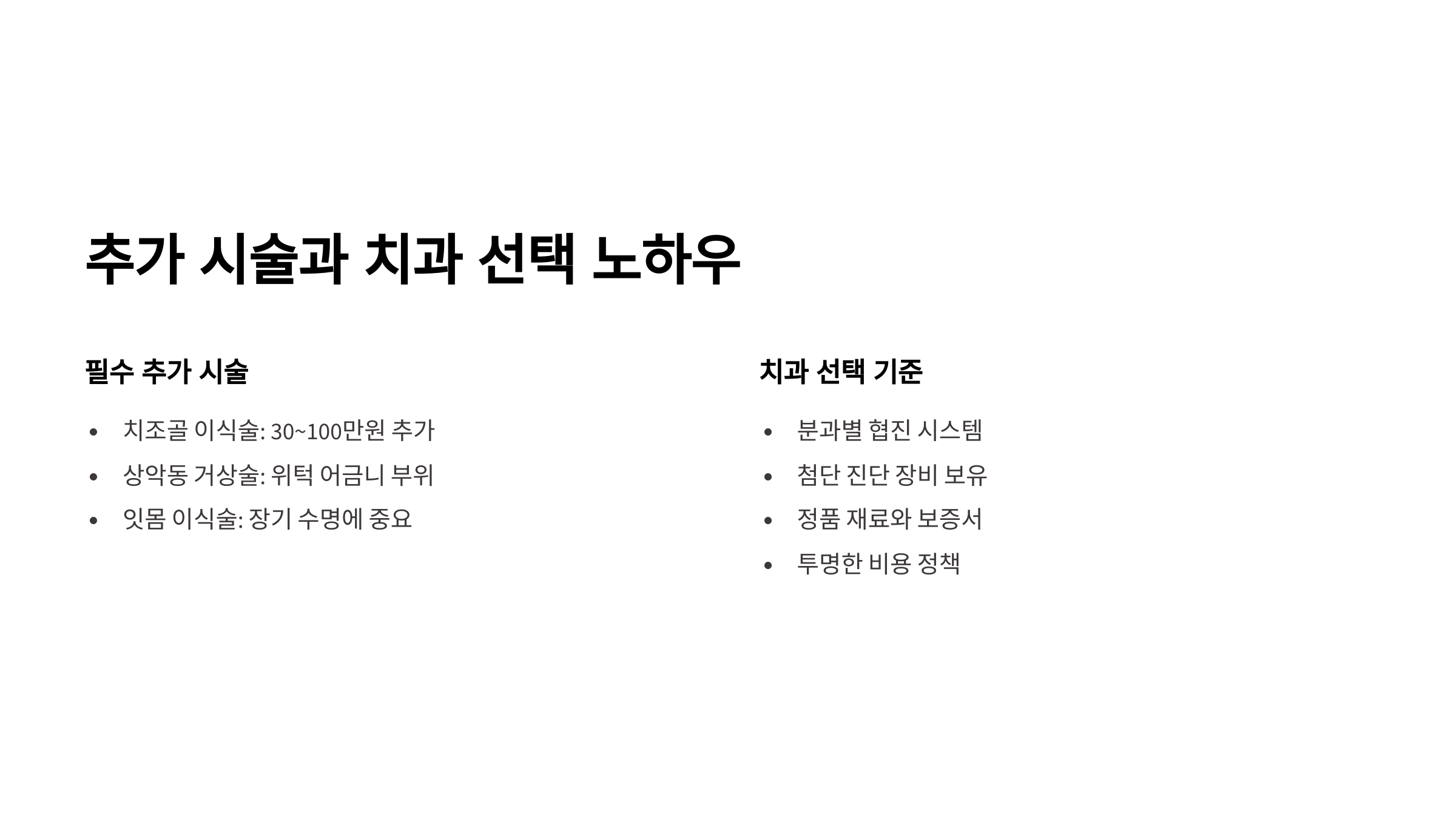 | 포함 항목 | 진단, 수술, 지대주, 보철물 비용 포함 | PFM 크라운(비귀금속도재관) 기준. 추가적인 뼈이식 등은 비급여 |