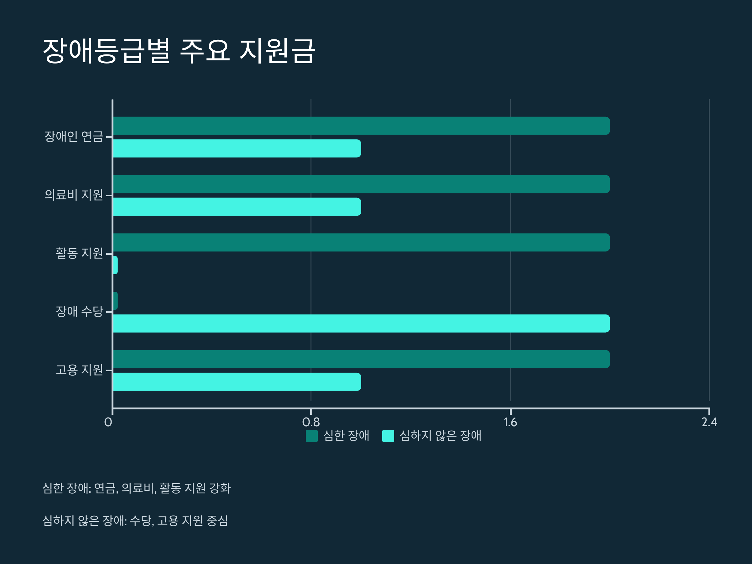 장애 등급에 따라 혜택 내용과 지원 규모가 달라집니다. 다음은 주요 혜택입니다.